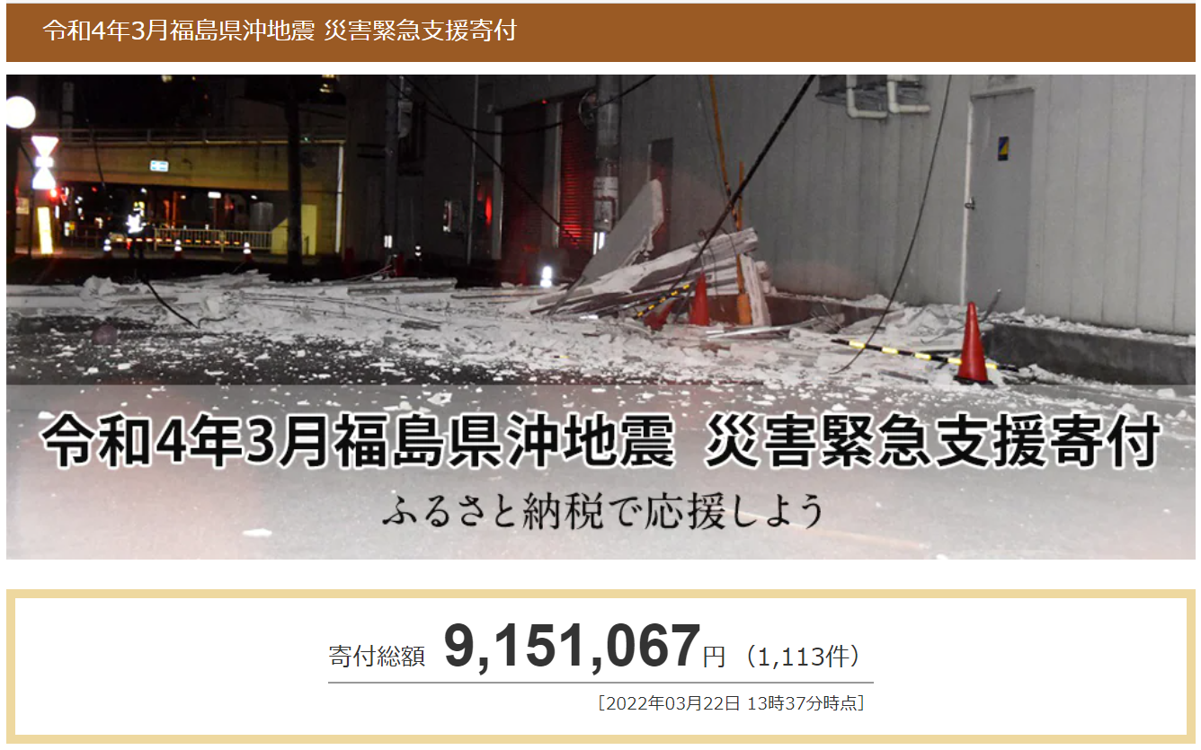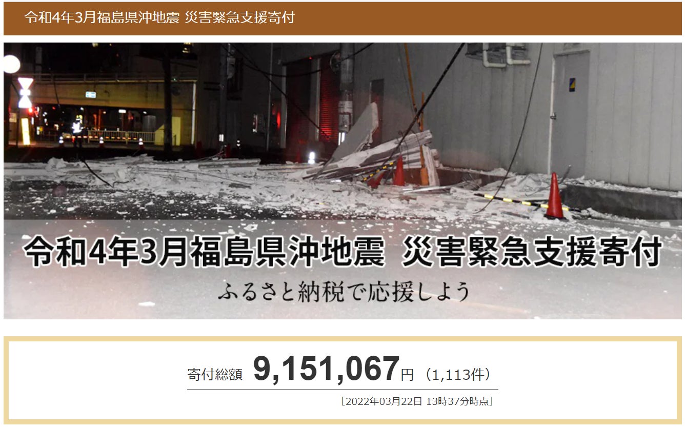 ふるさと納税ポータルサイト「さとふる」(https://www.satofull.jp/)を運営する株式会社さとふる(本社:東京都中央区、代表取締役社長:藤井 宏明)は、2022年3月17日に開設した「令和4年3月福島県沖地震 災害緊急支援寄付サイト」(https://www.satofull.jp/static/oenkifu/202203_fukushima.php)にて、3月22日より、宮城県大崎市、富谷市、福島県新地町の寄付を受け付け開始します。これにより本サイトで扱う自治体数は18自治体となりました。3月22日午後1時半時点で、本サイトを通して900万円以上(1,100件以上)の寄付が寄せられています。各自治体に集まっている寄付総額などの最新情報は、「令和4年3月福島県沖地震 災害緊急支援寄付サイト」に記載しています。