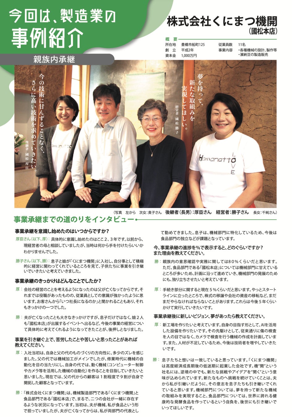 今回は、「新たなものへ挑戦を続ける」という先代の意思を引き継ぎ、持続的発展を遂げる市内製造業の親族内承継事例を紹介しています。