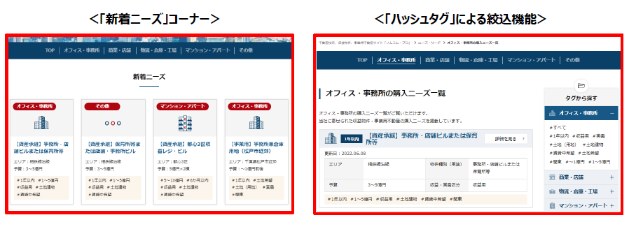 この度のリニューアルでは、従来比で掲載情報数を大幅に増強するとともに、売却検討者であるユーザーが「物件種別」を軸に「エリア」「予算」「築年」「収益用/実需」「購入希望時期」などの複数のハッシュタグ項目によって、購入ニーズの条件を絞り込んで検索することが可能になりました。「ニーズ・サーチ」でユーザーが指定できる検索項目数は大手仲介会社が運営するサイトでは最多※1 となります。また、情報量の増強に伴う副次的効果として、ユーザーは売却先の検索という直接的な目的に加え、現在の不動産マーケットにおける購入希望者層のボリュームや価格目線を、オンライン上で、感覚的に把握できるようになります。
