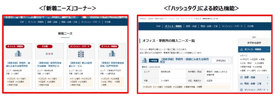 野村不動産ソリューションズ株式会社(本社:東京都新宿区/代表取締役社長:前田 研一)は、運営している投資用・事業用不動産サイト「ノムコム・プロ」(https://www.nomu.com/pro/)の既存コンテンツ 「こんな不動産を探しています」を大幅にリニューアルし、新たに「ニーズ・サーチ」としてリリースしましたので、お知らせいたします。