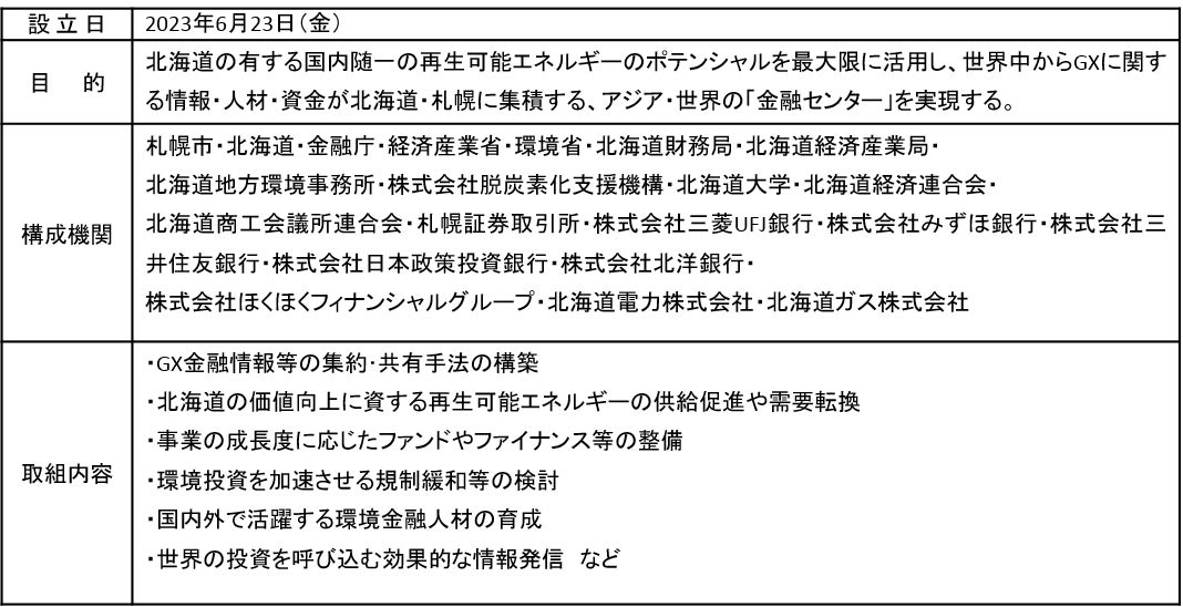 北海道・札幌市は、北海道の有する国内随一の再生可能エネルギーのポテンシャルを最大限に活用し、世界中からGX※に関する情報・人材・資金が北海道・札幌に集積する、アジア・世界の「金融センター」の実現に向け、産学官金からなるコンソーシアム「Team Sapporo-Hokkaido」を設立いたします。