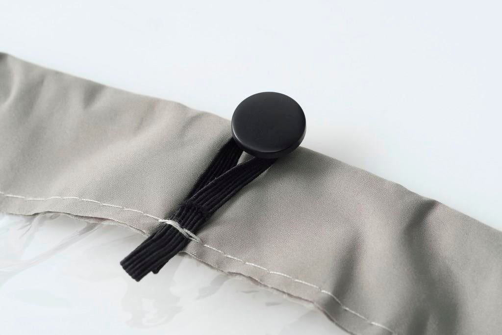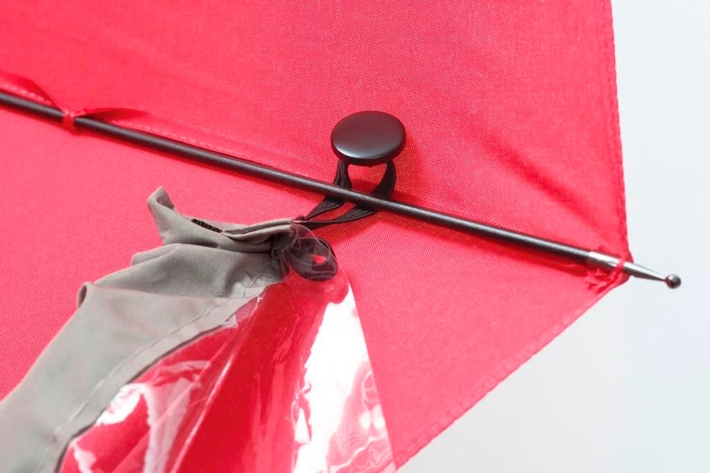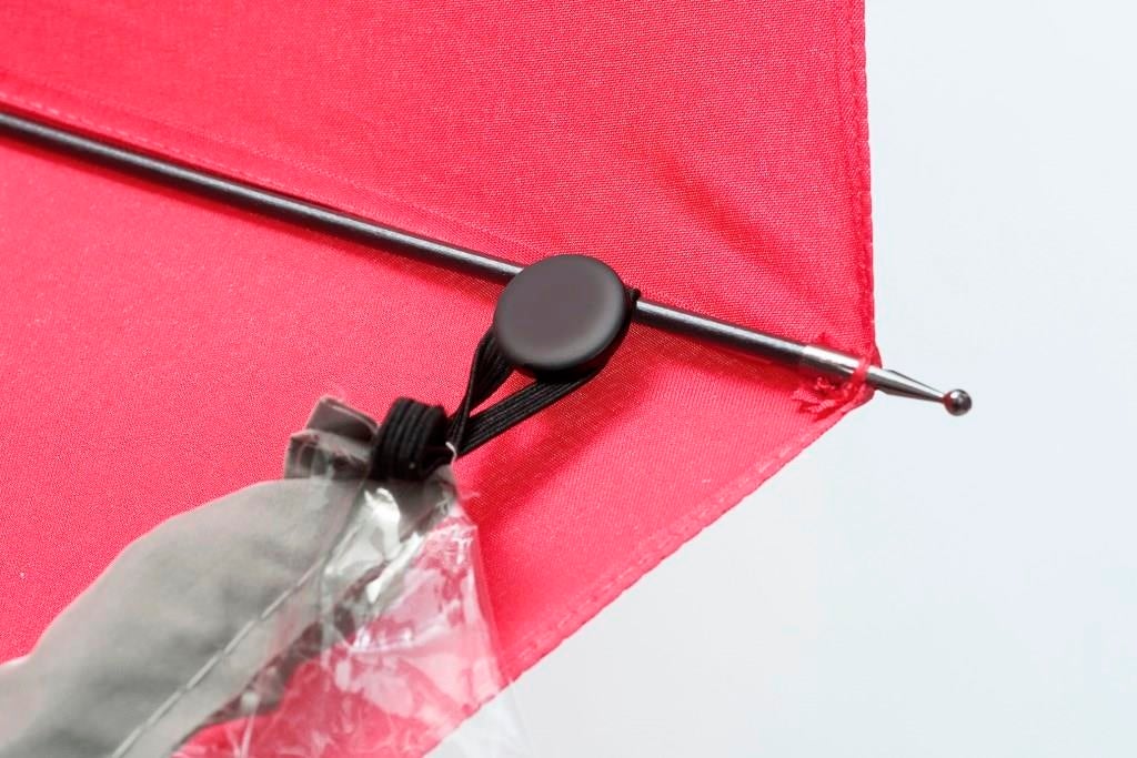 使用後は、そのまま閉じて折り返し、ホック付ベルトで留められます。本品と傘の濡れた面が重なるので、巻く時も手が濡れないのも嬉しいポイント。傘から本品をはずした後はコンパクトに畳んで持ち運びもラクラク。8本・16本骨の傘に対応。