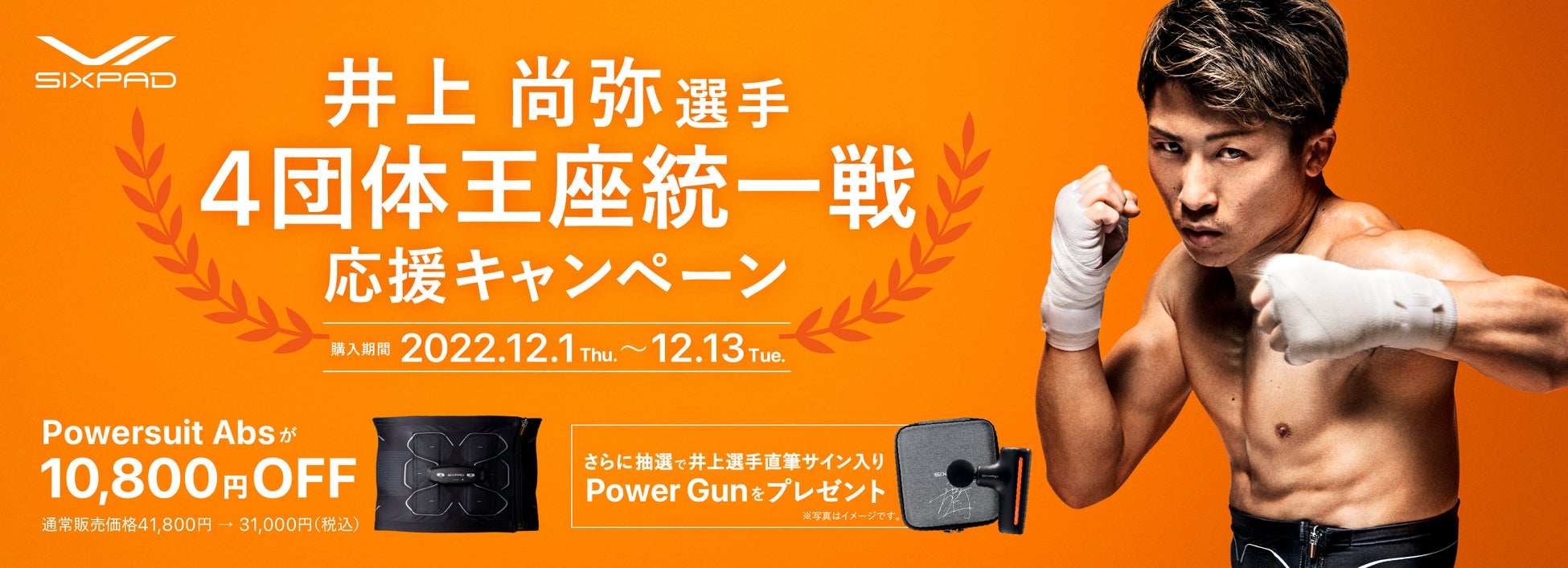 2022年12月1日(木)~ 12月13日(火)までの期間中、「SIXPAD Powersuit Abs」通常価格41,800円を特別価格31,000円で販売いたします。「SIXPAD Powersuit Abs」購入者には、抽選で井上尚弥選手のサイン入り「SIXPAD Power Gun」をプレゼントいたします。