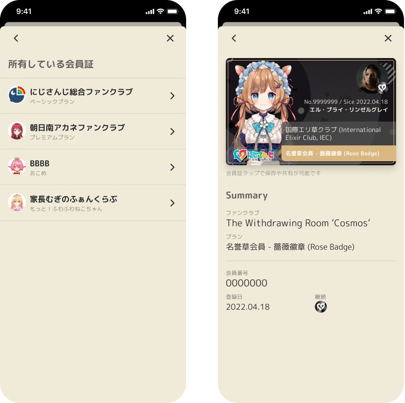 ・にじさんじ総合ファンクラブ、個別ライバーベーシックプラン、プレミアム年間プラン会員様を対象にアプリ版会員証が発行されます。