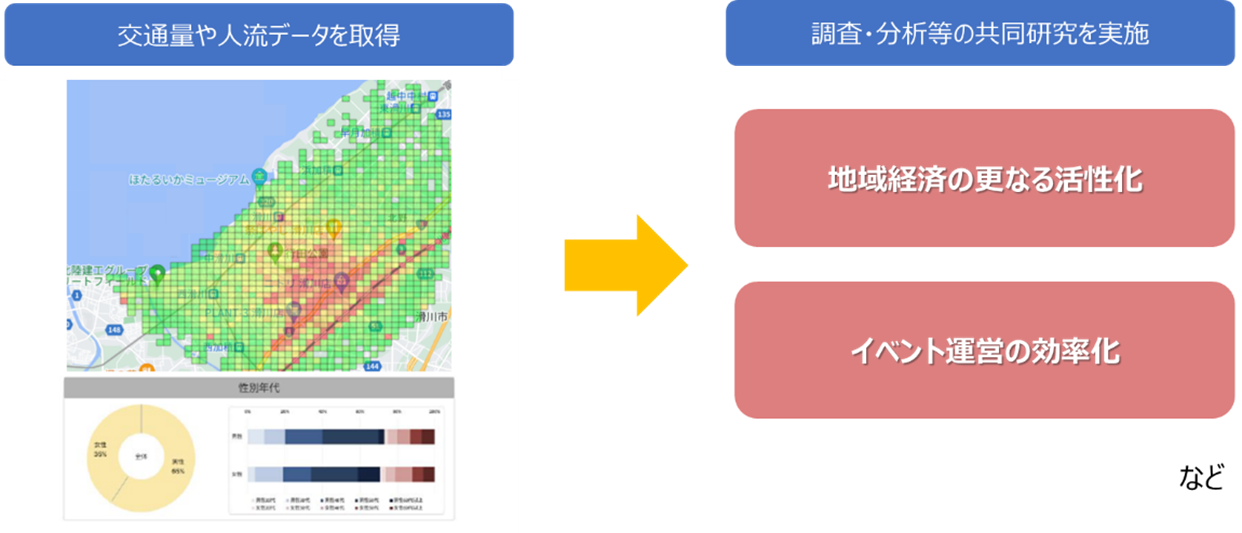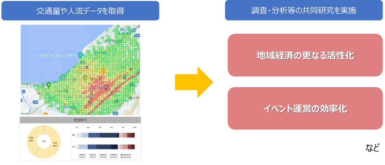 滑川市にて開催される地域イベントなど特殊な状況により発生する交通渋滞などの各種課題に対し、参加者の更なる満足度の向上を図るべく、2024年7月13日(土)・14日(日)の2日間にて開催される『ふるさと龍宮まつり』において、交通量・人口分布等のデータ取得・分析※1を行い、「ICT等を活用した有効な対策」の検討を共同研究として実施します。
