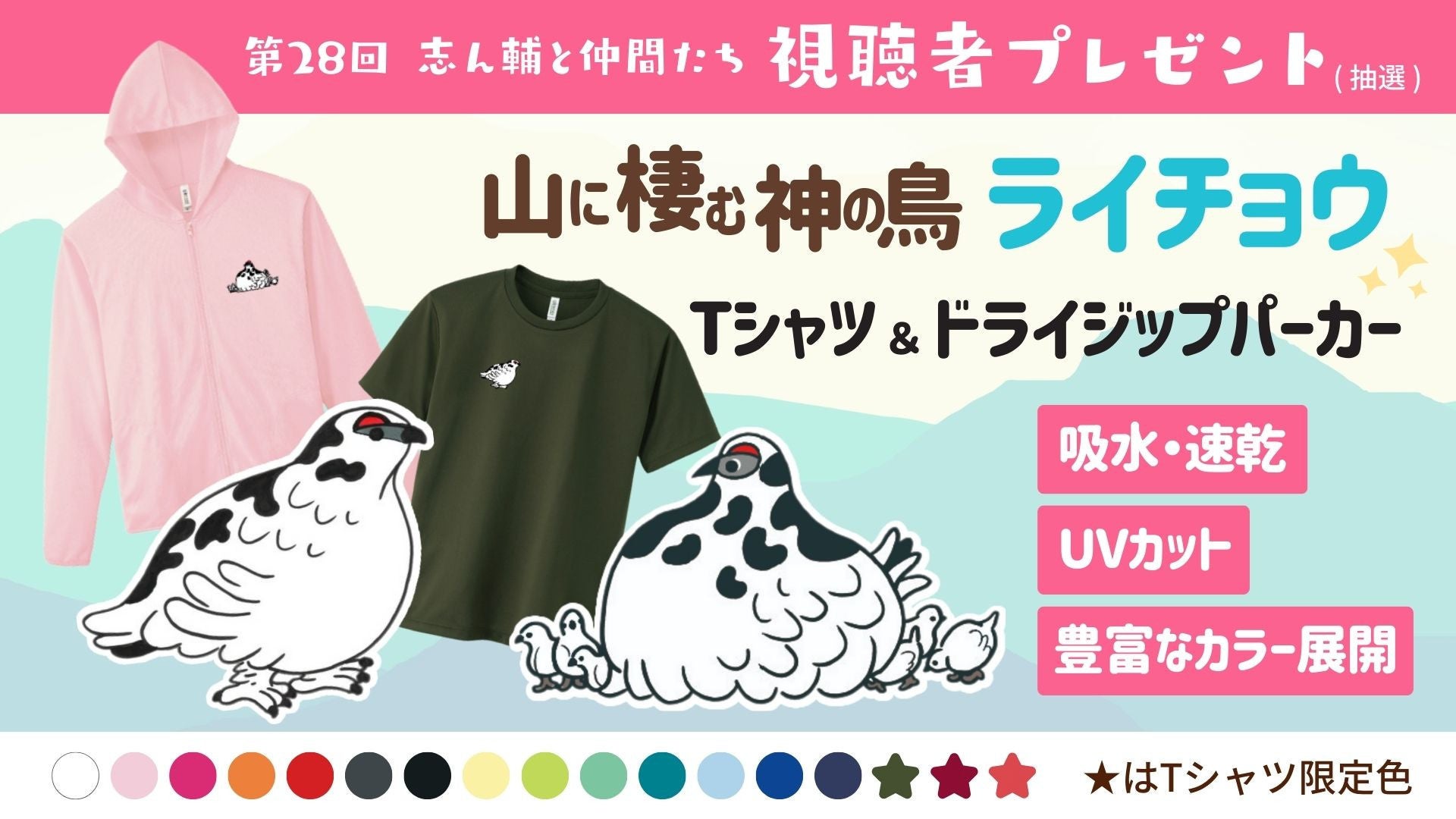 恒例の視聴者プレゼント(抽選)は、出演者ゆかりの品のほか、「大山詣り」にちなんで登山ツアーのパイオニア・毎日新聞旅行が提供の「ドライTシャツ」「ドライジップパーカー」です。高山に生息するライチョウをあしらった絶賛予約販売中のTシャツとパーカーです(詳細は公式サイトをご覧ください)。