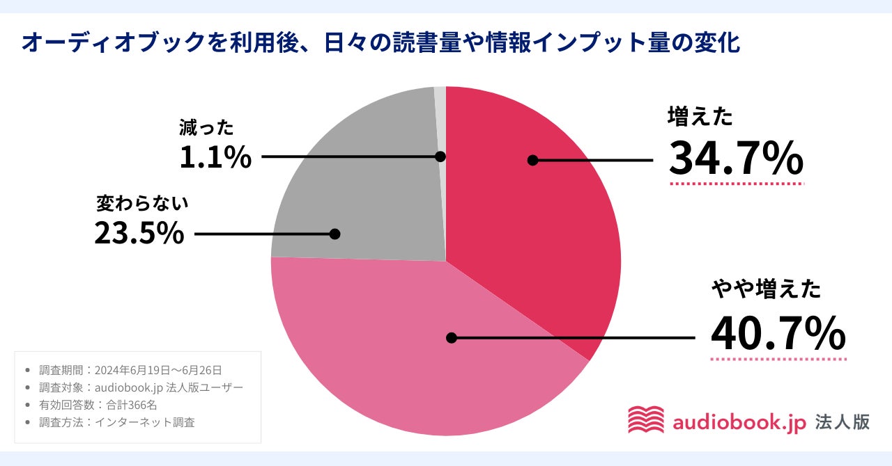 次にオーディオブックの利用による効果を調査。オーディオブックの利用後、日々の読書量や情報インプット量が増えたかについて聞くと、75.4%が増えた(「増えた」34.7%、「やや増えた」40.7%)と回答しました。