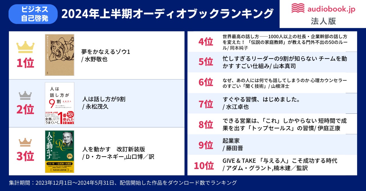 audiobook.jp 法人版におけるオーディオブックの作品の再生時間をもとに順位付けした、2024年上半期(2023年12月1日〜2024年5月31日)の「総合」と「ビジネス・自己啓発」部門の人気ランキング トップ10を発表します。