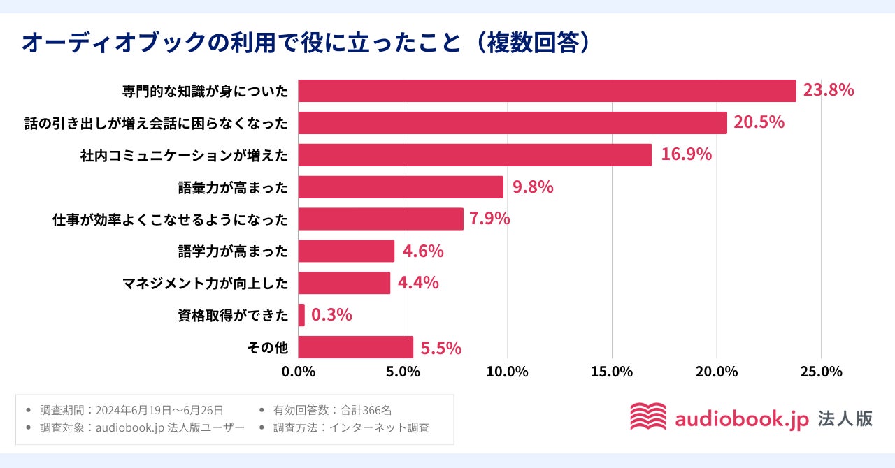 仕事で役に立った具体的なエピソードについても聞くと、「オーディオブックを聴くことで傾聴能力が維持されチームメンバーとのコミュニケーションに役立った」「移動時間が新しいことをインプットする時間に変わった」などの声が寄せられました。