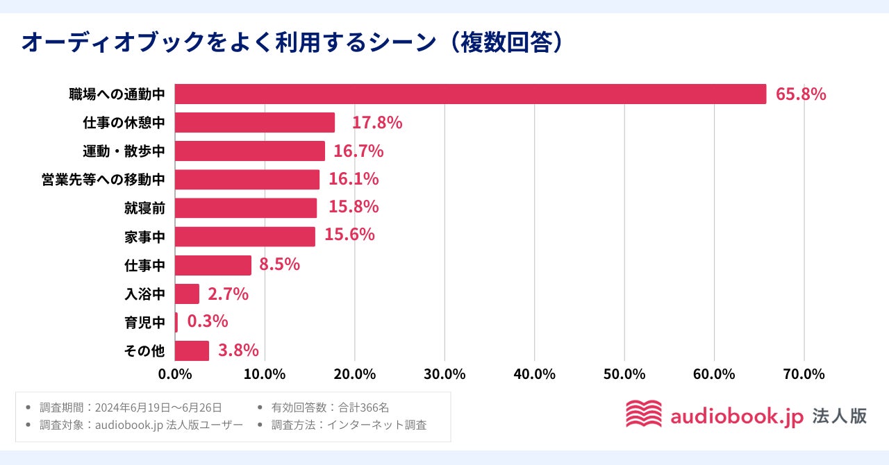 では、どのようなシーンでオーディオブックを利用しているのか? 結果は『職場への通勤中』が65.8%で断トツ。一般のaudiobook.jpユーザーへのアンケートでは、家事中や運動中の利用も多く30%を超えますが(※2)、audiobook.jp 法人版ユーザーでは、他の利用シーンと大きく差をつけて、日々の通勤時に利用する人が圧倒的でした。