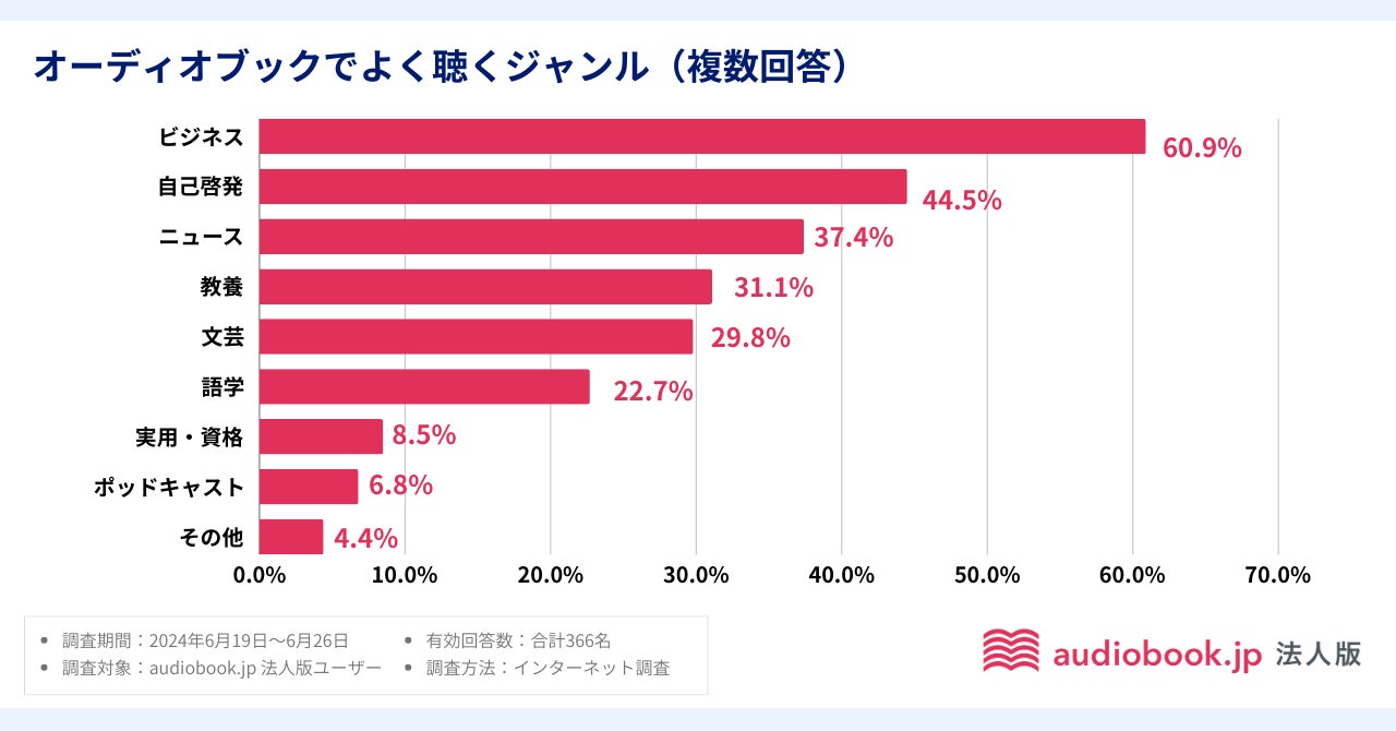 株式会社オトバンク(本社:東京都文京区、代表取締役社長:久保田裕也、以下「オトバンク」)が提供する法人向けのオーディオブック聴き放題プラン「audiobook.jp 法人版」の利用者数が2024年6月に1万人を突破したことを記念し、「audiobook.jp 法人版」の利用状況に関する調査結果を発表いたします。