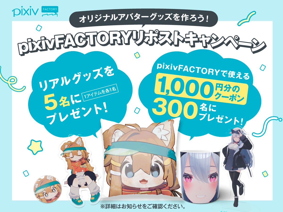 BOOTH Roomへの来場者数100万突破を記念して、期間中、BOOTH公式Xアカウント(https://x.com/booth_pm )の対象ポストをリポストし、専用フォームから応募した方の中から抽選で、pixivFACTORYで制作したリアルグッズや、pixivFACTORYでグッズ制作に使えるクーポンをプレゼントします。