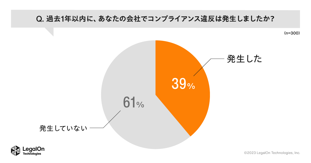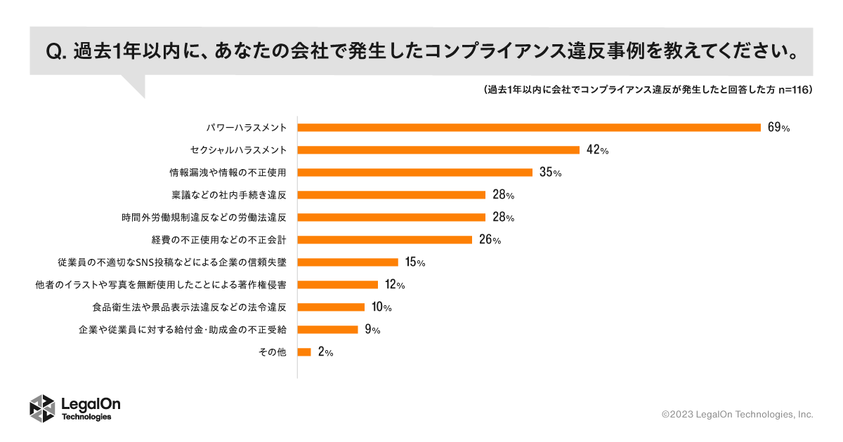 ・39%が、過去1年以内に企業でコンプライアンス違反が「発生した」と回答。実際に発生したコンプライアンス違反事例トップは「パワハラ」、約7割の担当者が挙げる結果に。