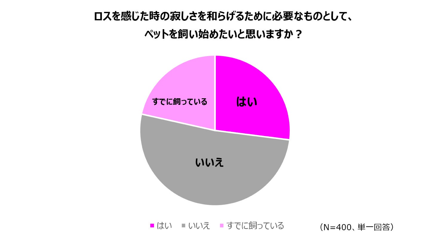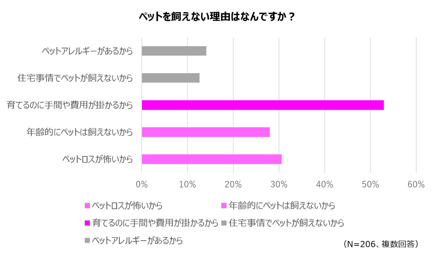 「ロス」を和らげる存在としてペットを選択肢に入れないと回答した人は51.5%にのぼりました。その主な理由として、「育てる手間や費用がかかる」(53%)や「ペットロスが怖い」(31%)といった点が大きな課題であることが明らかになりました。
