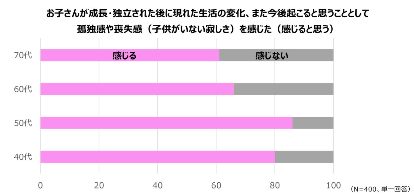 子どもが成長・独立した後に「孤独感・喪失感」を感じることを不安視(実際に感じている人を含む)している人が40代、50代それぞれ80%越えしている一方で、実際子どもの独立を経験されている人が多いと予測される60代・70代では、「孤独感・喪失感」を感じていない人が約40%の結果となりました。