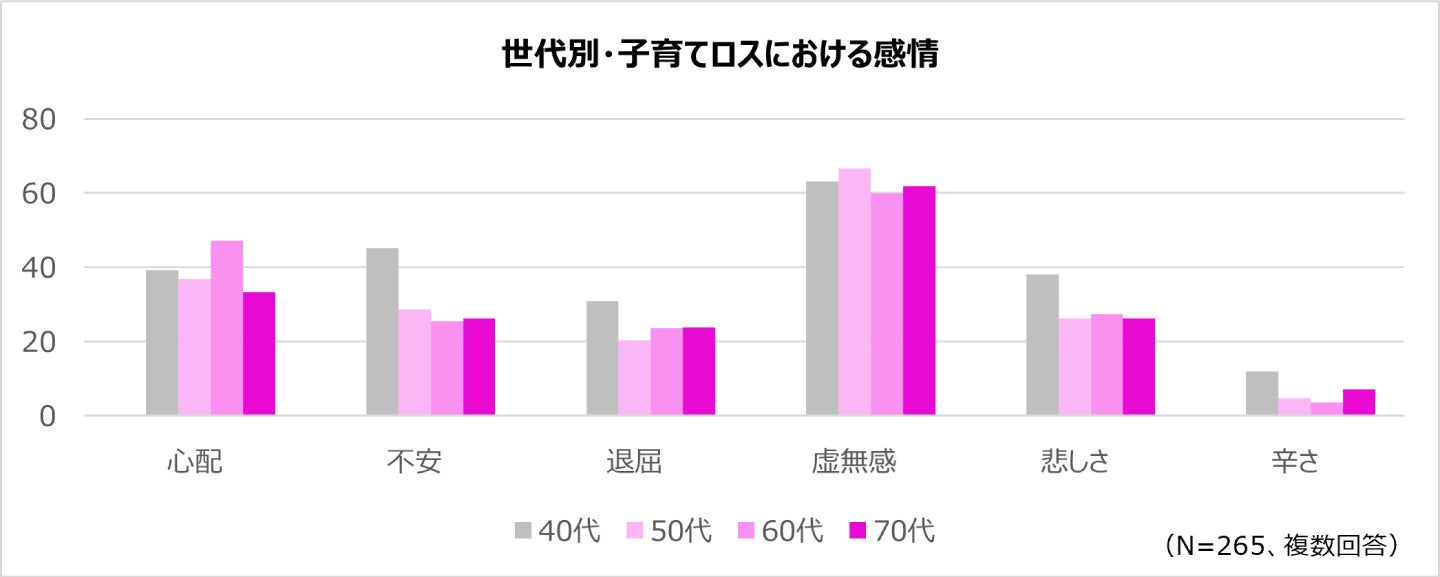 「子育てロス」により、起こりうる感情として、「虚無感」が最も多い結果になりました。さらに、40代~70代の中で、50代の女性が「虚無感」を最も感じているという実態が明らかになりました。また、「虚無感」に次いで、「心配」、「不安」を感じる人が多いことがわかりました。