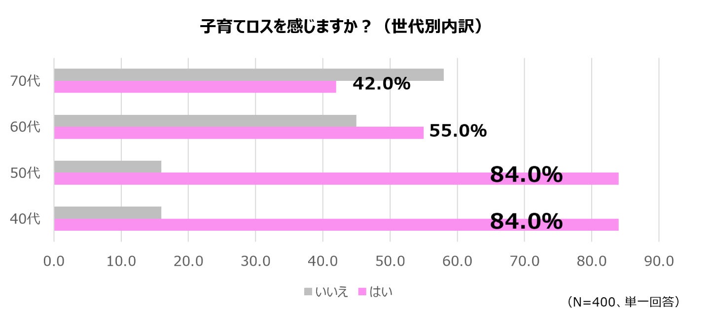 仕事や生活が変わるタイミングで感じるさまざまなロスの中で、「子育てロス」を感じる人は約7割(66.3%)となり、「ペットロス」(41%)や「パートナーロス」(34%)を大きく上回る結果になりました。