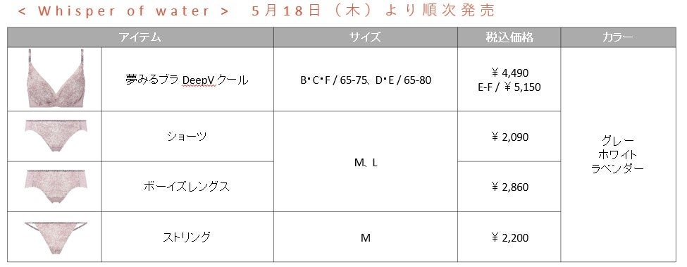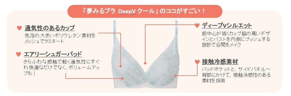 こだわったのは、太陽の光を受けて繊細にきらめく波しぶきの連なりをイメージした、レースやカラーの透明感。ブラジャーは、接触冷感性のある素材を採用した「夢みるブラ DeepV クール」が登場します。夏のファッションにうれしい魅惑の谷間を演出しながら、涼しく、軽く、快適に過ごせる夏ブラです!