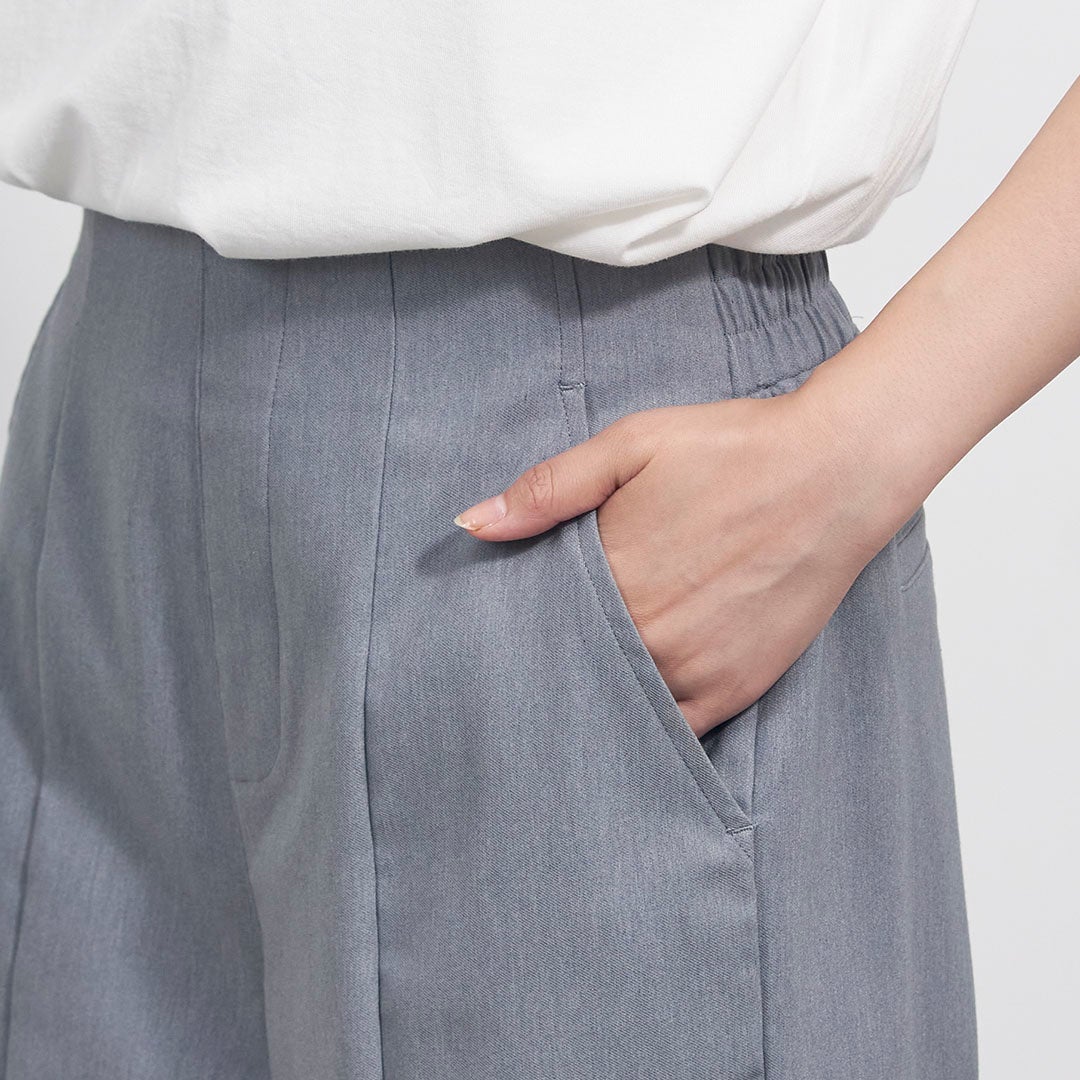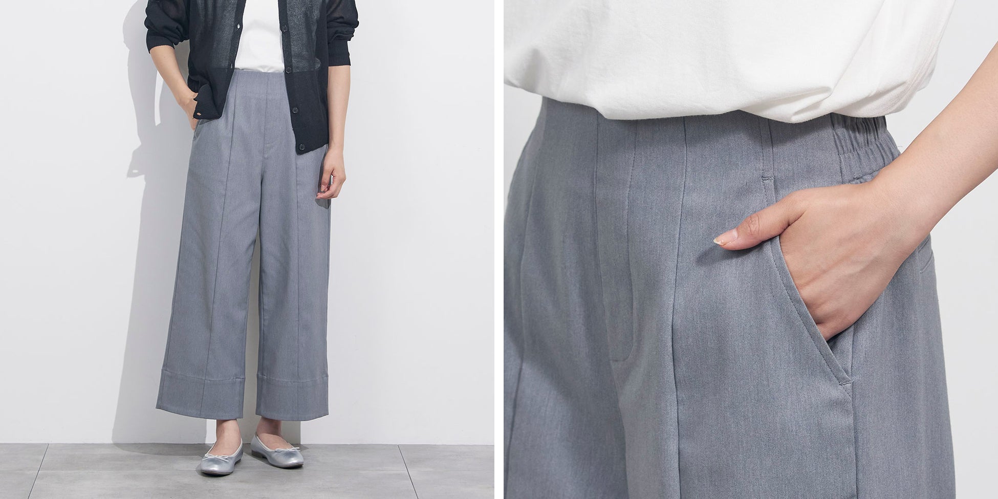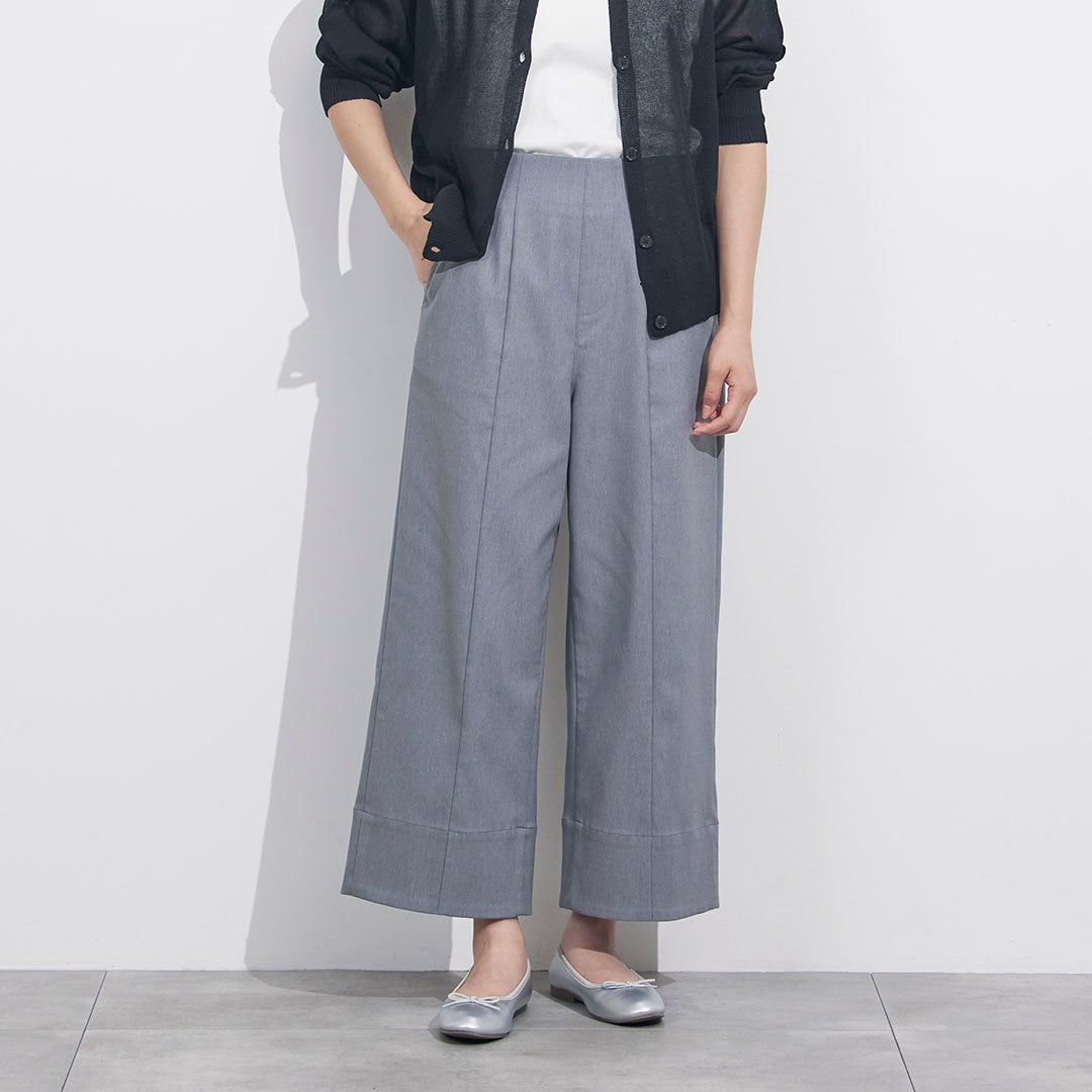 トレンドのワイドシルエットは、広がり過ぎず体型をカバーしながら程よくスリムに見せてくれます。センターの切り替えデザインで視線を縦に促し、脚長効果も抜群。