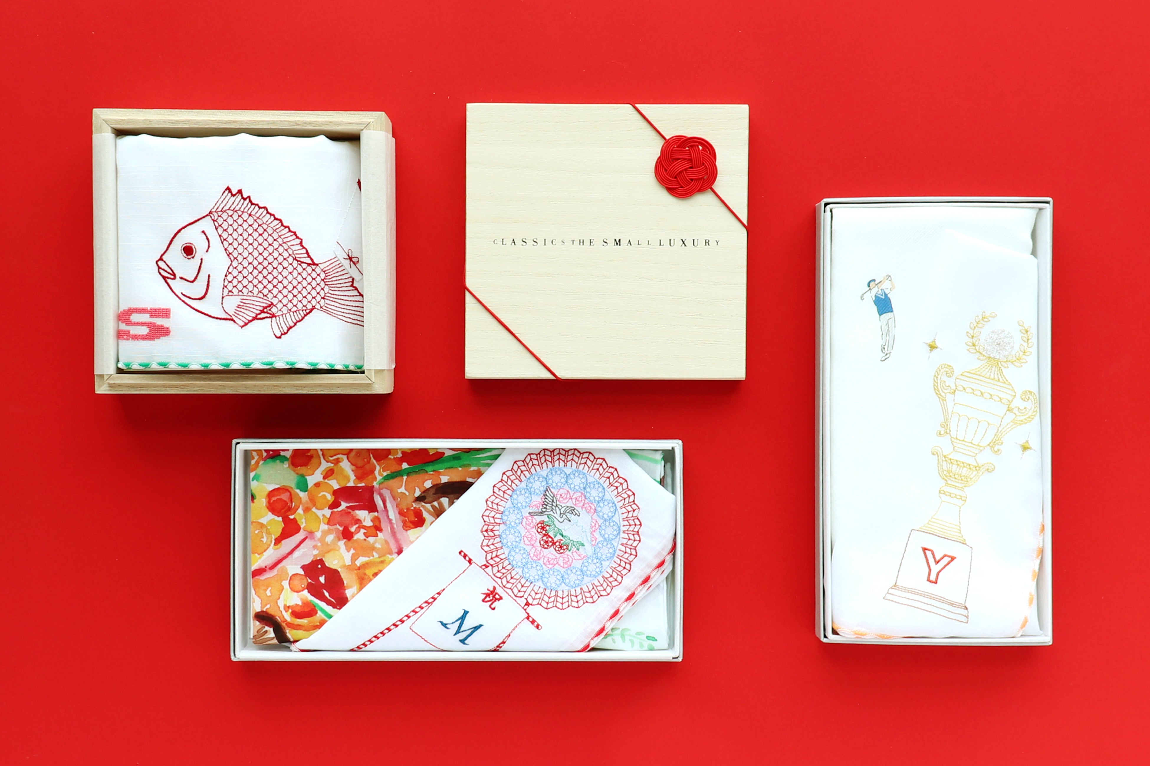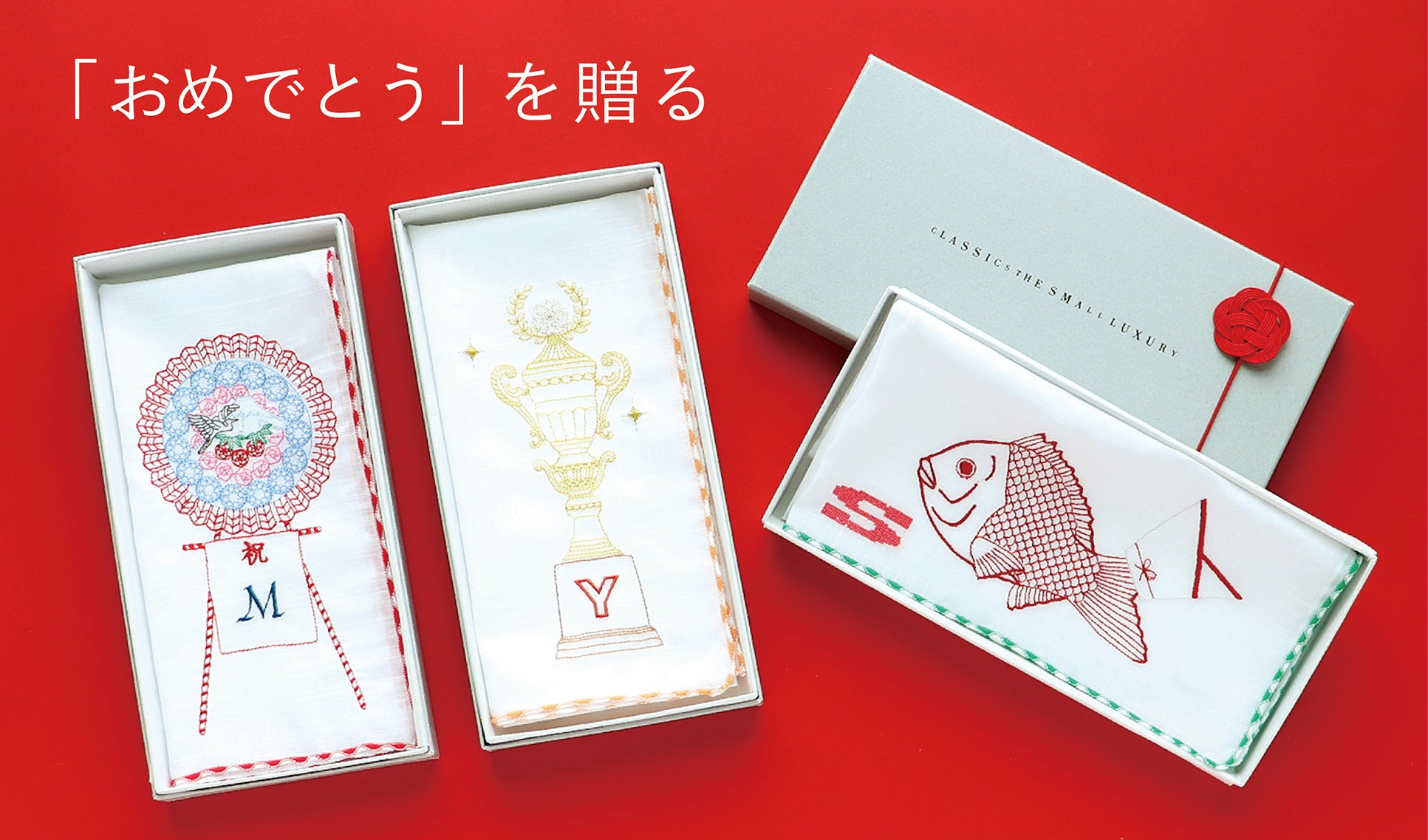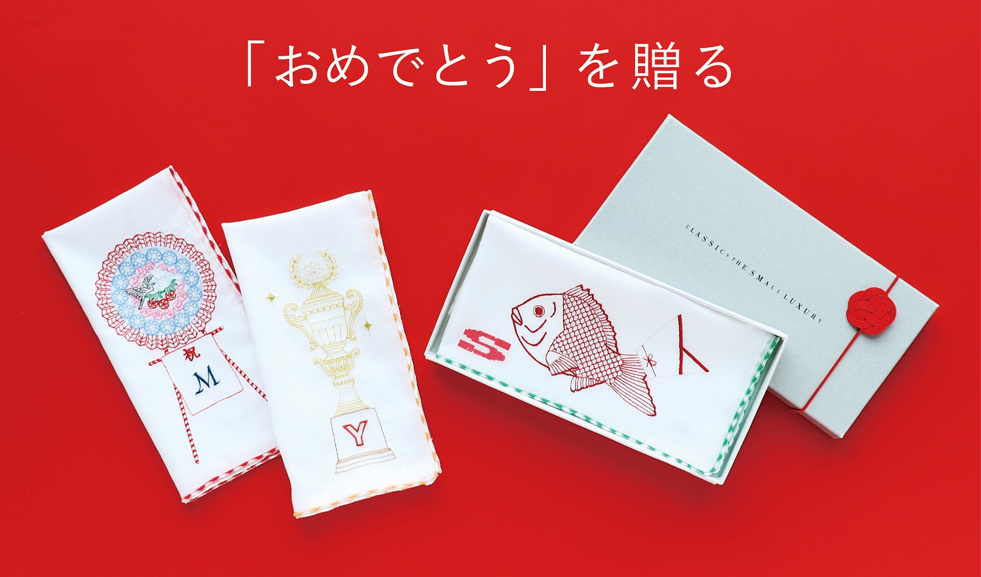CLASSICS the Small Luxury (クラシクス・ザ・スモールラグジュアリ)は、東京、日本橋人形町を拠点に日本のハンカチーフ業界のパイオニアである、繊維製品企画販売のブルーミング中西株式会社(本社 東京都 中央区 取締役社長 中西一) が運営するハンカチーフ専門店です。「おめでとう」の気持ちをカタチにした「お祝いハンカチ」シリーズの新作を発売しました。