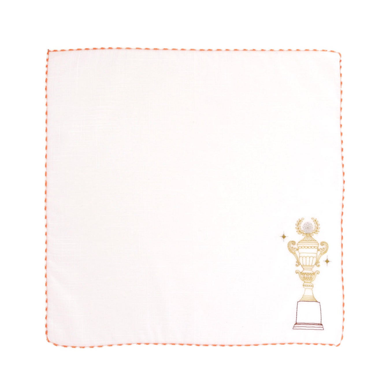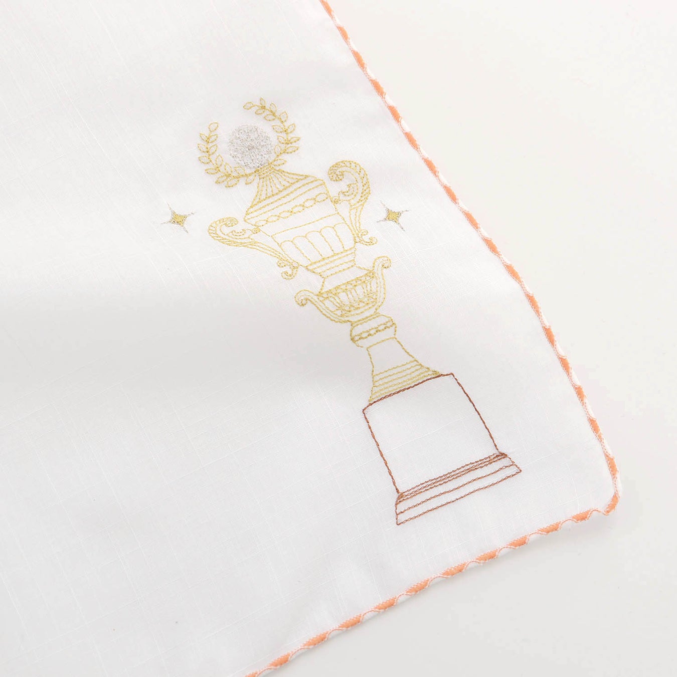黄金に輝くトロフィーを刺繍で細やかに再現した一枚。縁の縫製は、勝利の喜びを表すオレンジに、清潔感のあるホワイトを組み合わせた2色を使用し華やかに仕上げました。