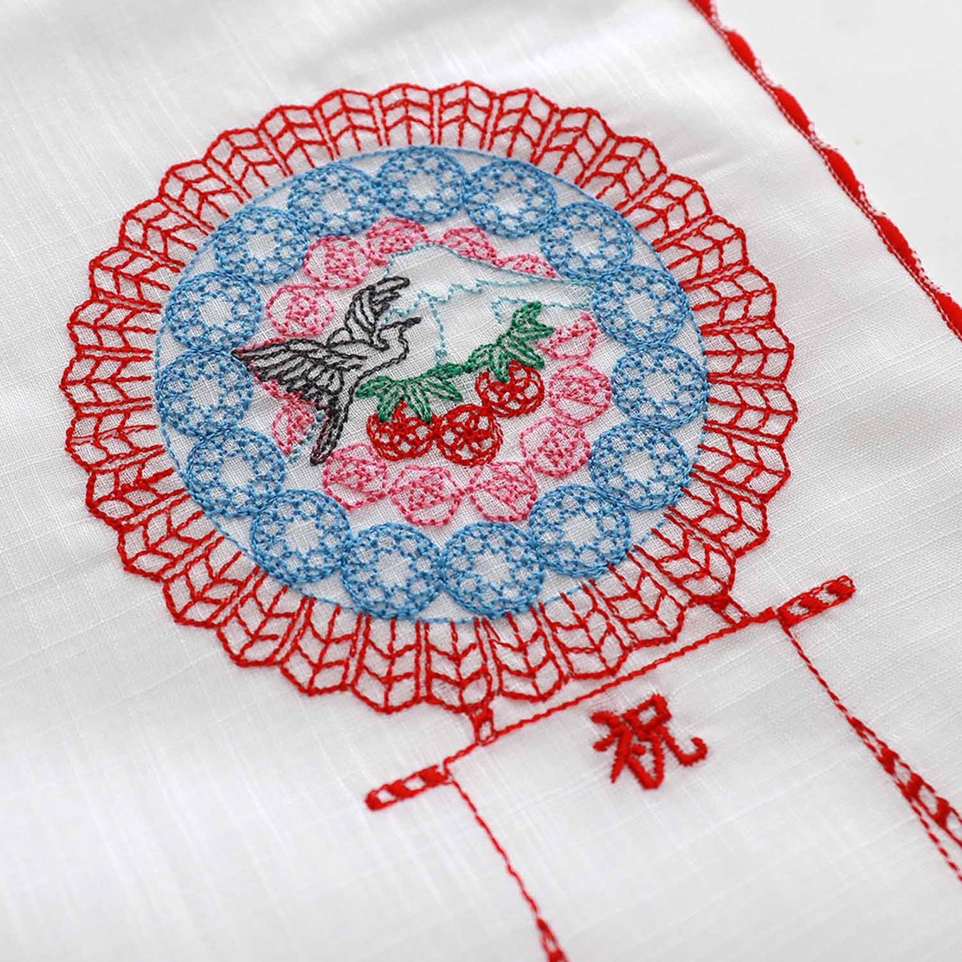 昨年の発売以来ご好評いただいている「花輪」のハンカチーフ。富士山、鶴、松といったおめでたいモチーフに、バラとダイヤをあわせて、ブランドオリジナルの花輪をデザインしました。縁の縫製は、紅白の2色の糸を使用し、おめでたいカラーリングに仕上げました。