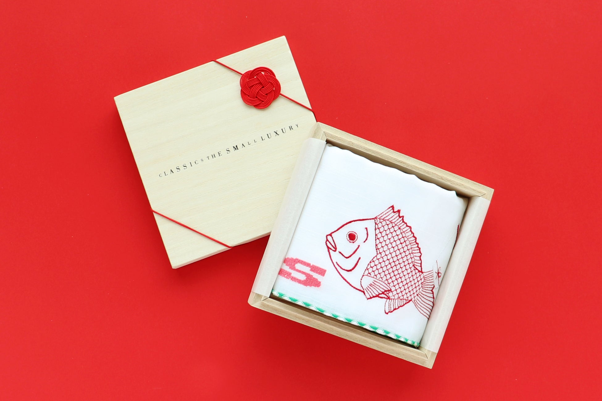 今回は、「めでたい」を象徴するユーモラスな『鯛』モチーフと、努力や功績を称える『トロフィー』を刺繍で表現した2柄をご用意。贈る相手やお祝いのシーンに合わせて選べる、特別な一枚に仕上がっています。人生には、思わず笑顔になるお祝いの瞬間がいくつも訪れます。その大切なひとときに、「おめでとう!」の気持ちを、そっと手渡すことができるハンカチです。