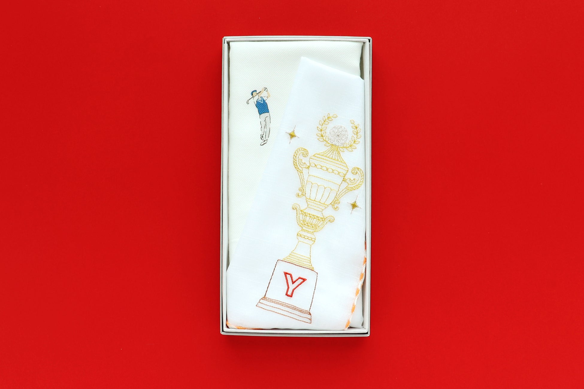 存在感のある大ぶりなイニシャル刺繍をカスタマイズして特別な一枚に。昇進や就職祝い、合格祝いや勝利を称えるイベントなどにも幅広くお使いいただけます。ブランドオリジナルの桐箱もご用意しております。