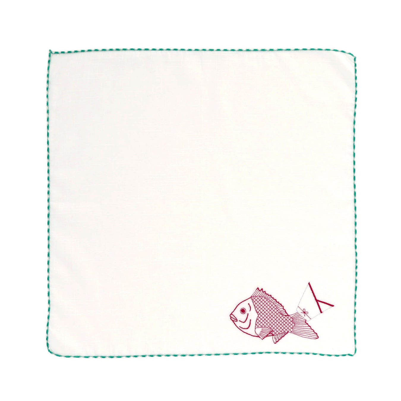 「めでたい」の語呂合わせから慶びごとのモチーフのひとつである鯛。思わずクスっと笑みがこぼれるユーモラスな表情の鯛が印象的な一枚。開運招福、縁起の良い鯛は、ご結婚、出産祝いなど様々なお祝いの贈り物としてぴったりです。