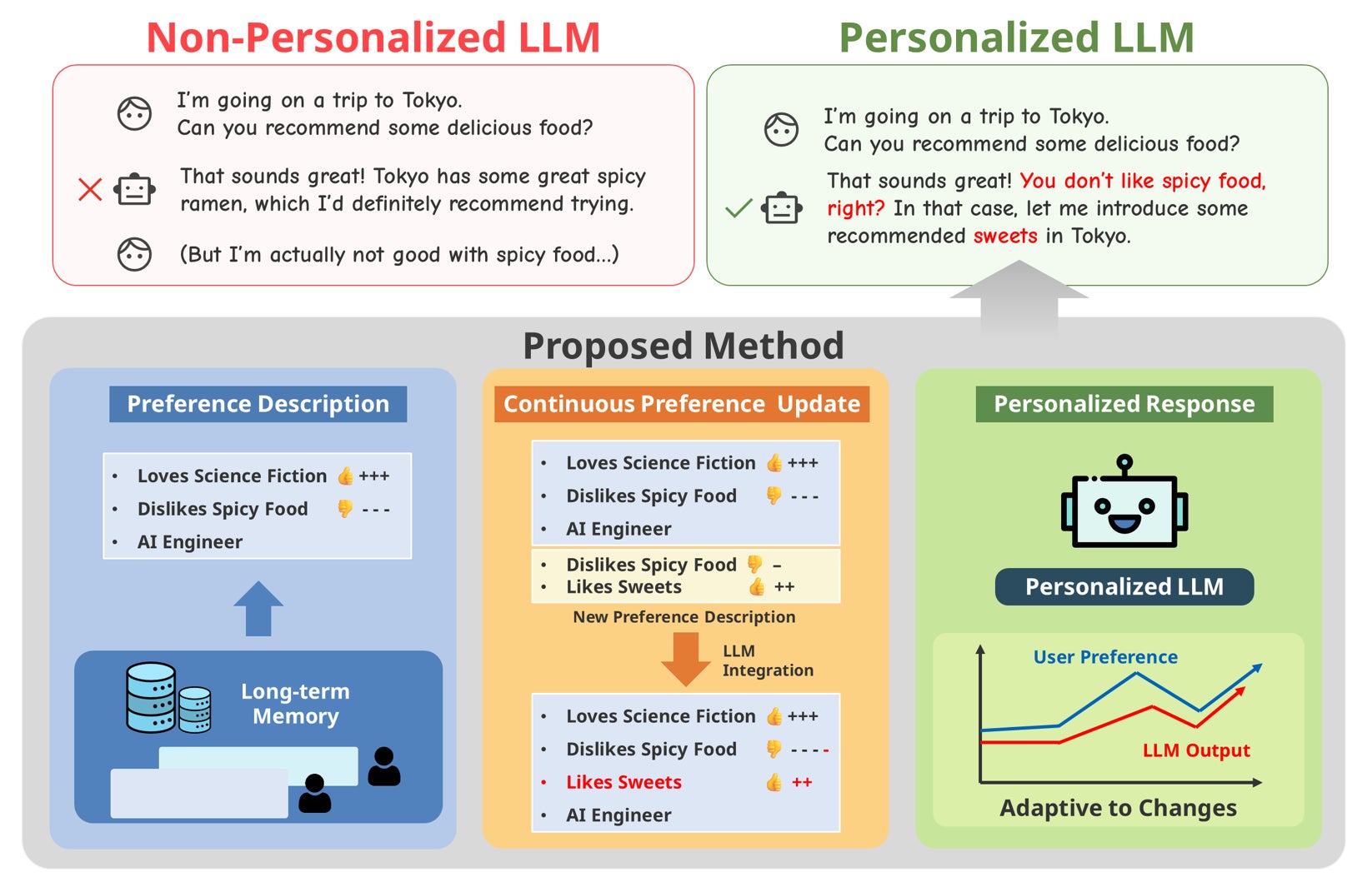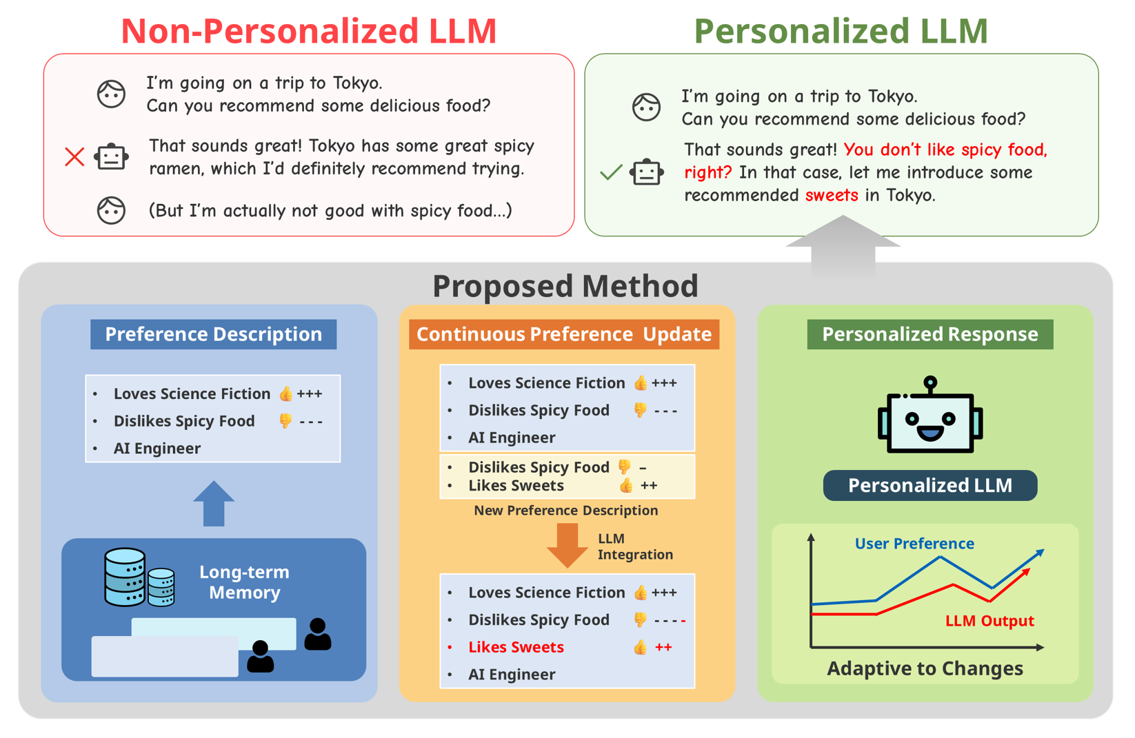 これにより、AIはユーザーの嗜好変化をリアルタイムに反映しつつ、矛盾のない応答を生成できるようになります。提案手法はモデルの再学習や大規模なシステム改修を必要としないため、既存のAIサービスにも容易に組み込める点が特長です。 実験では、複数のベンチマークデータセットを用いて評価を実施し、従来手法と比較して、ユーザーの嗜好により適合した応答を安定して生成できることを確認しました。