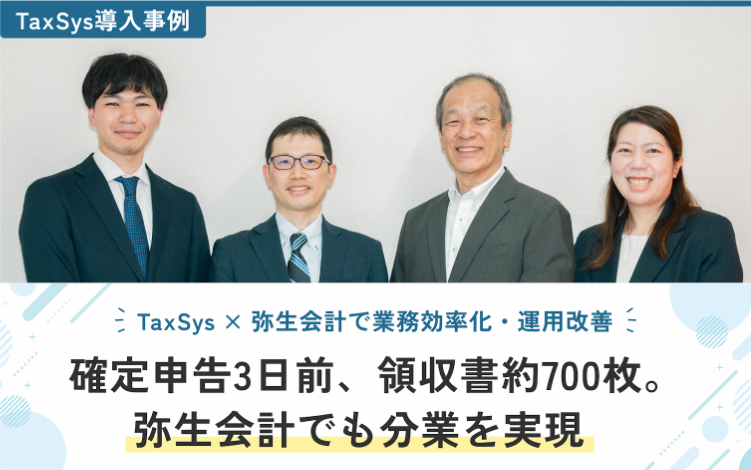 本事例では、確定申告3日前に1年分の会計資料が届くという厳しい状況の中、TaxSys(タクシス)の弥生会計インポート機能を活用することで手入力作業を削減。弥生会計を利用したままチーム分業を実現し、繁忙期でも案件を進めやすい運用を構築しました。