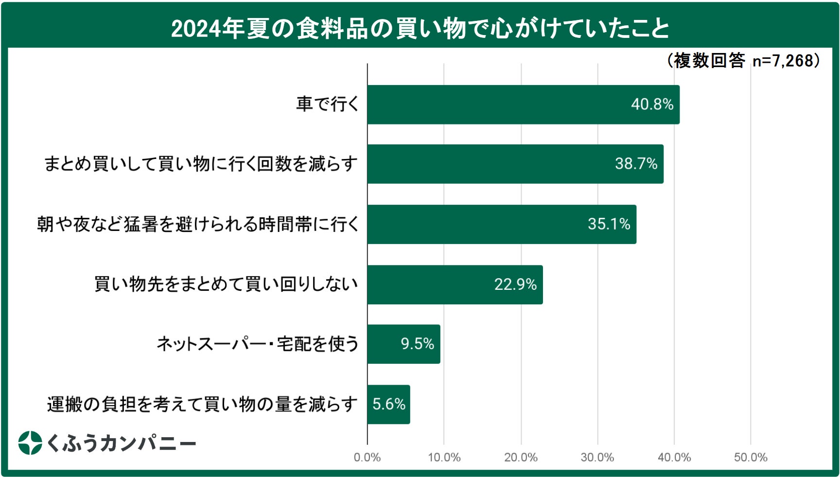●食料品の買い物は「車で」「まとめ買い」「猛暑を避けた時間に」