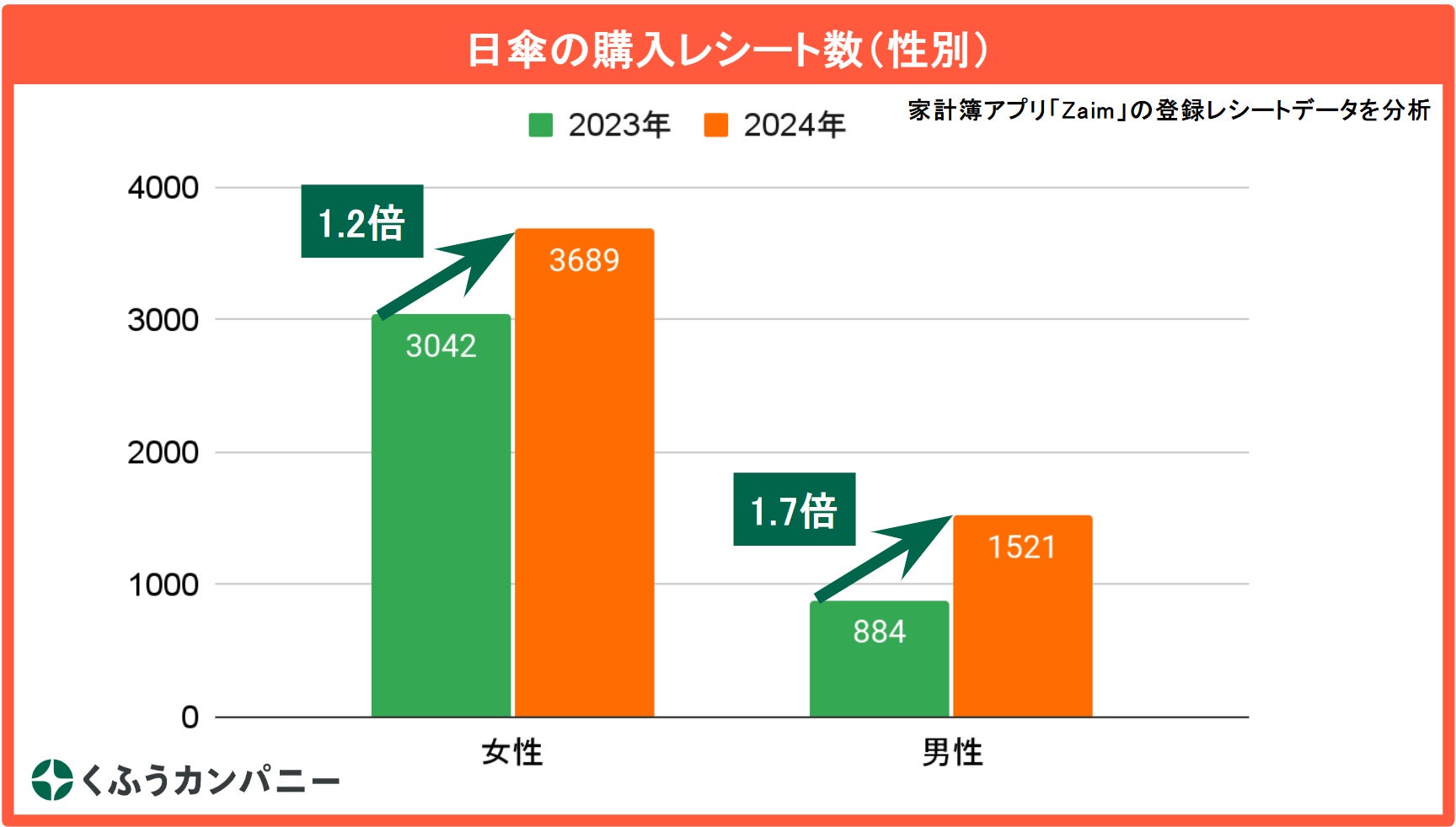 以前は主に女性が使用していた日傘ですが、ここ数年は男性や子どもが使用する姿も見られるようになり、商品も拡充されています。ユーザーの性別による登録レシート枚数を見ると、女性は昨年比約1.2倍、男性は約1.7倍となっており、男性用の購入の広がりによる影響も大きいと推察されます。