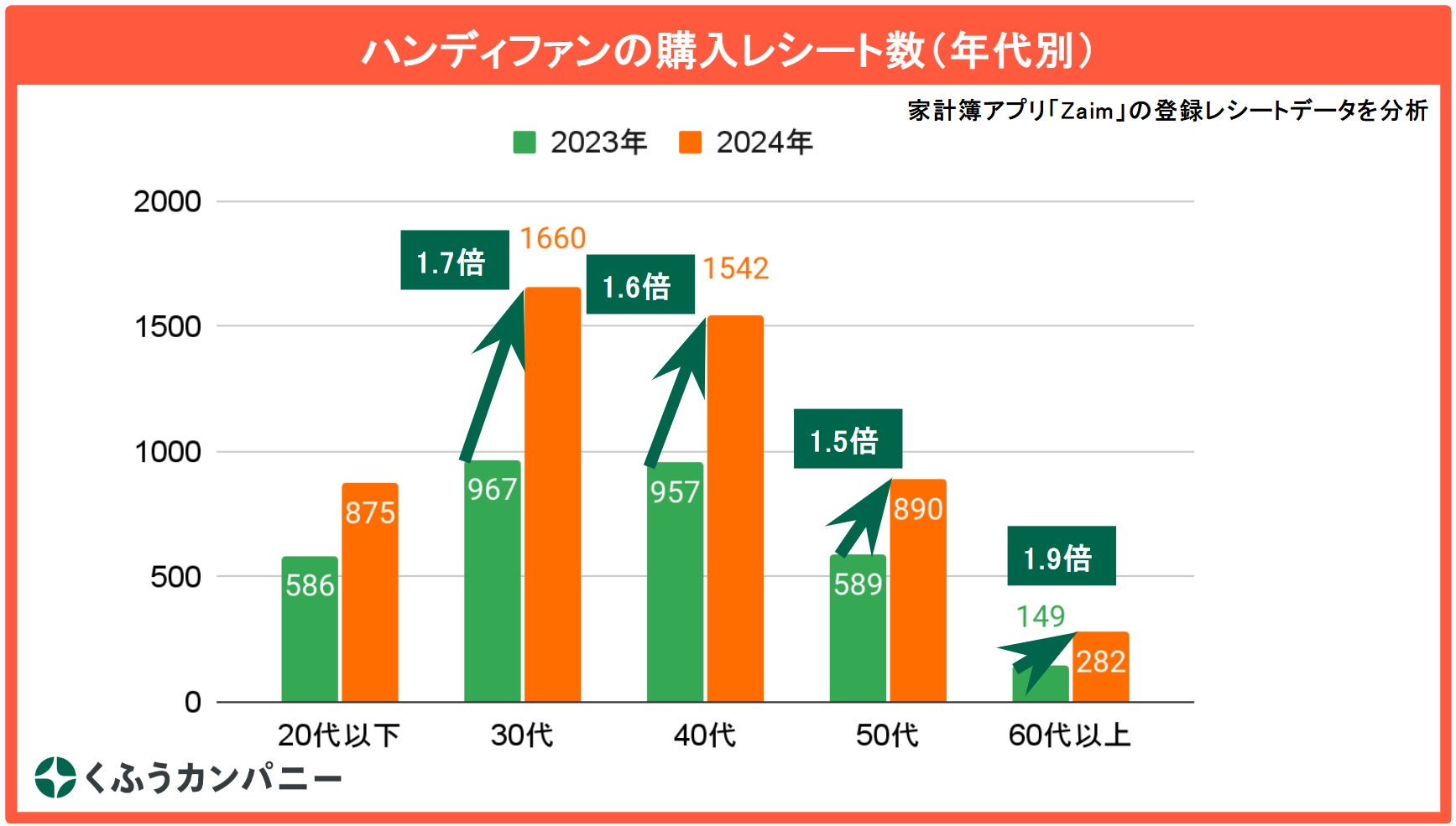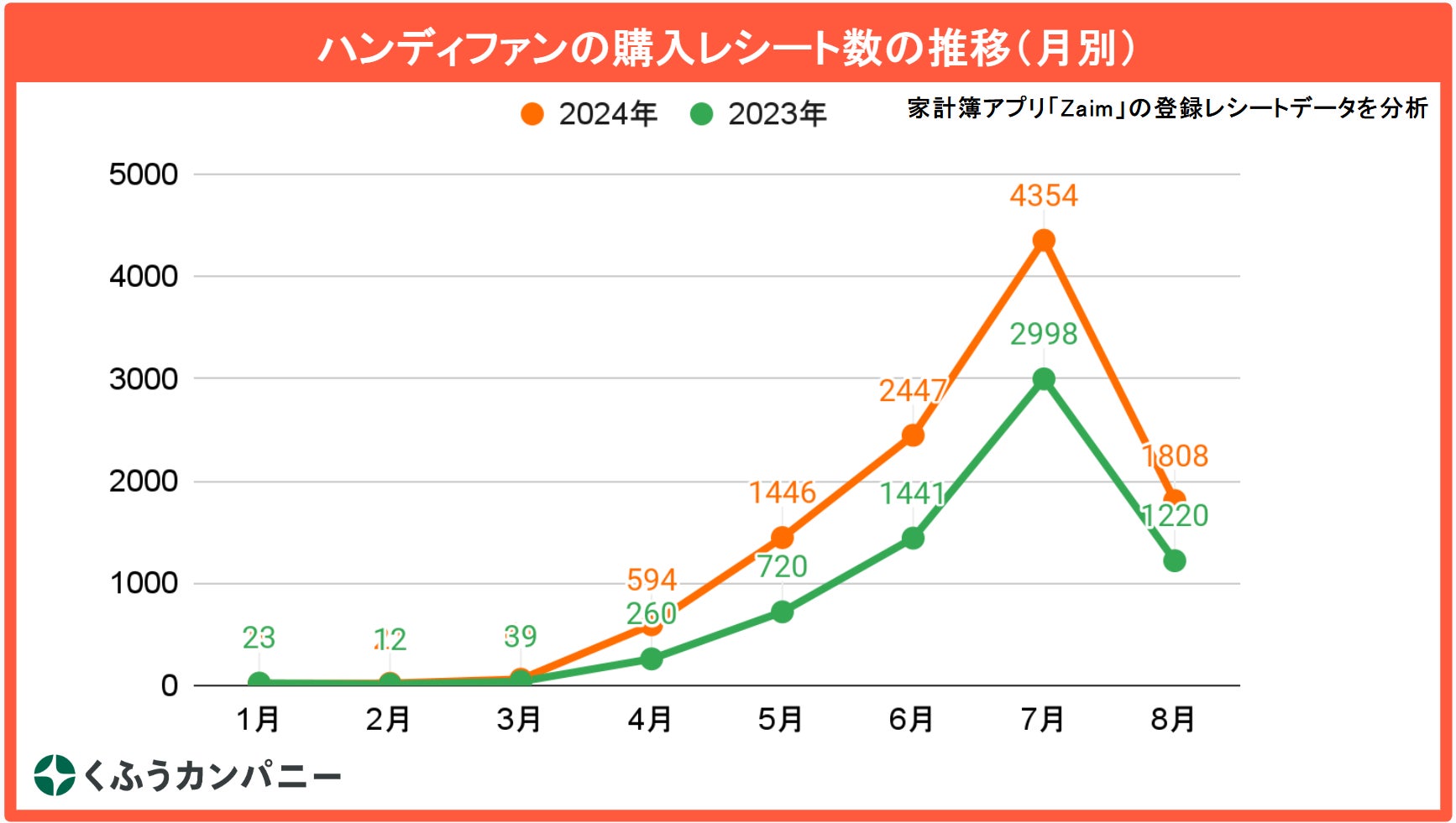持ち歩ける小型扇風機「ハンディファン」も2024年は2023年を上回るレシート登録枚数が続き、6月には前年と比べて約1.7倍の購入数に。購入ピークの7月も約1.5倍となりました。
