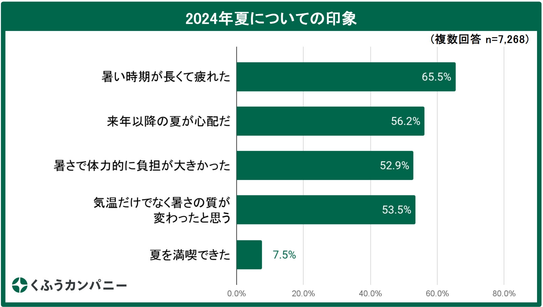 そんな夏を終えて、回答者の大半は「暑い時期が長くて疲れた(65.5%)」と回答。「夏を満喫できた(7.5%)」にはほど遠い感想をもつ人が多いことがわかりました。
