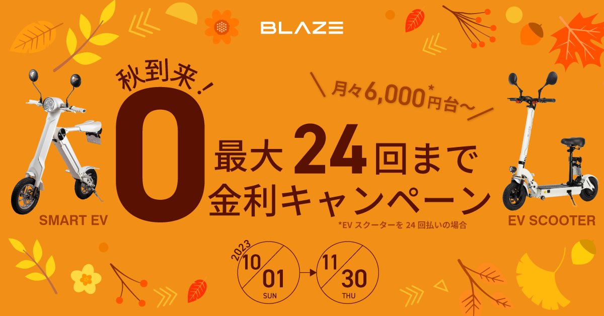こちらのキャンペーンでは、ブレイズが提唱する新ブランドコンセプト「LIFE EV」(*下記参照) の下に展開する、①簡単折りたたみ・車載/室内保管もOK:ブレイズ スマートEV(2輪)、②立ち/座り乗り2WAY対応:ブレイズ EVスクーター(2輪)が、最大24回、金利0円で月々6,000円台から(※)ご購入できます。(※ブレイズEVスクーターを24回払いの場合)
