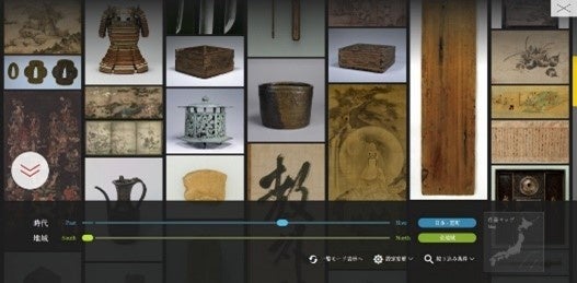| 〈Step2〉 ビジュアルの下部にある「時代」と「地域」のスライダーを動かしていくと、次々と該当の文化財が切り替わって流れます。 |