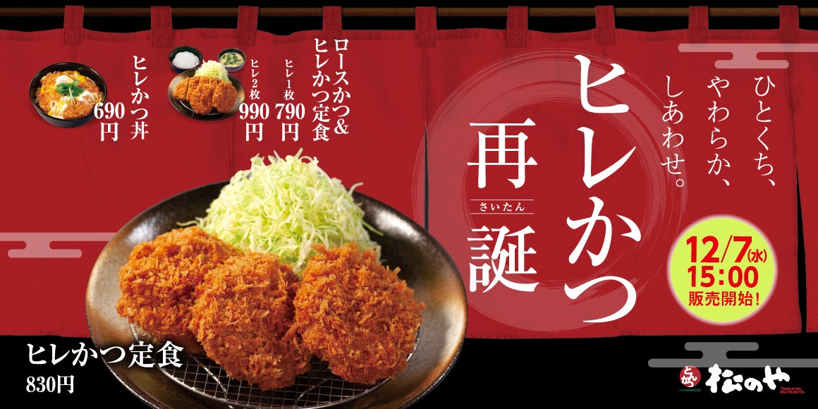 株式会社松屋フーズ(本社:東京都武蔵野市、代表取締役社長:瓦葺 一利)では、とんかつ専門店の「松のや・松乃家」におきまして、2022年12月7日(水)午後3時より、「ヒレかつ」を発売いたします。