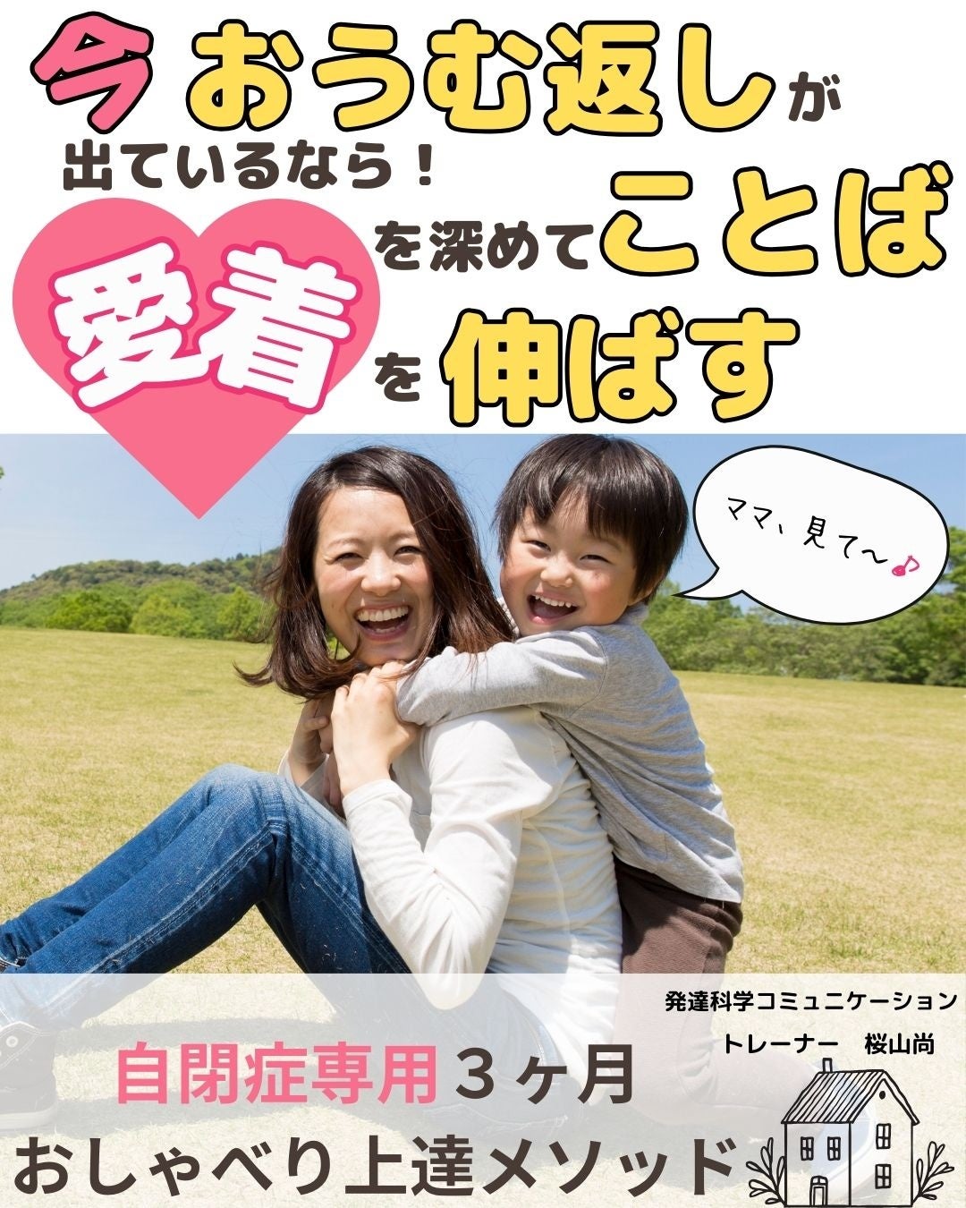 はじめまして 発達科学コミュニケーショントレーナー桜山尚です。言葉の苦手な自閉っ子と親子の愛着を深めてことばを伸ばす専門家として活動しています。この度は、今おうむ返しが出ている自閉っ子と親子の愛着を深めて言葉を伸ばす方法をお伝えする電子書籍をリリースいたしました。