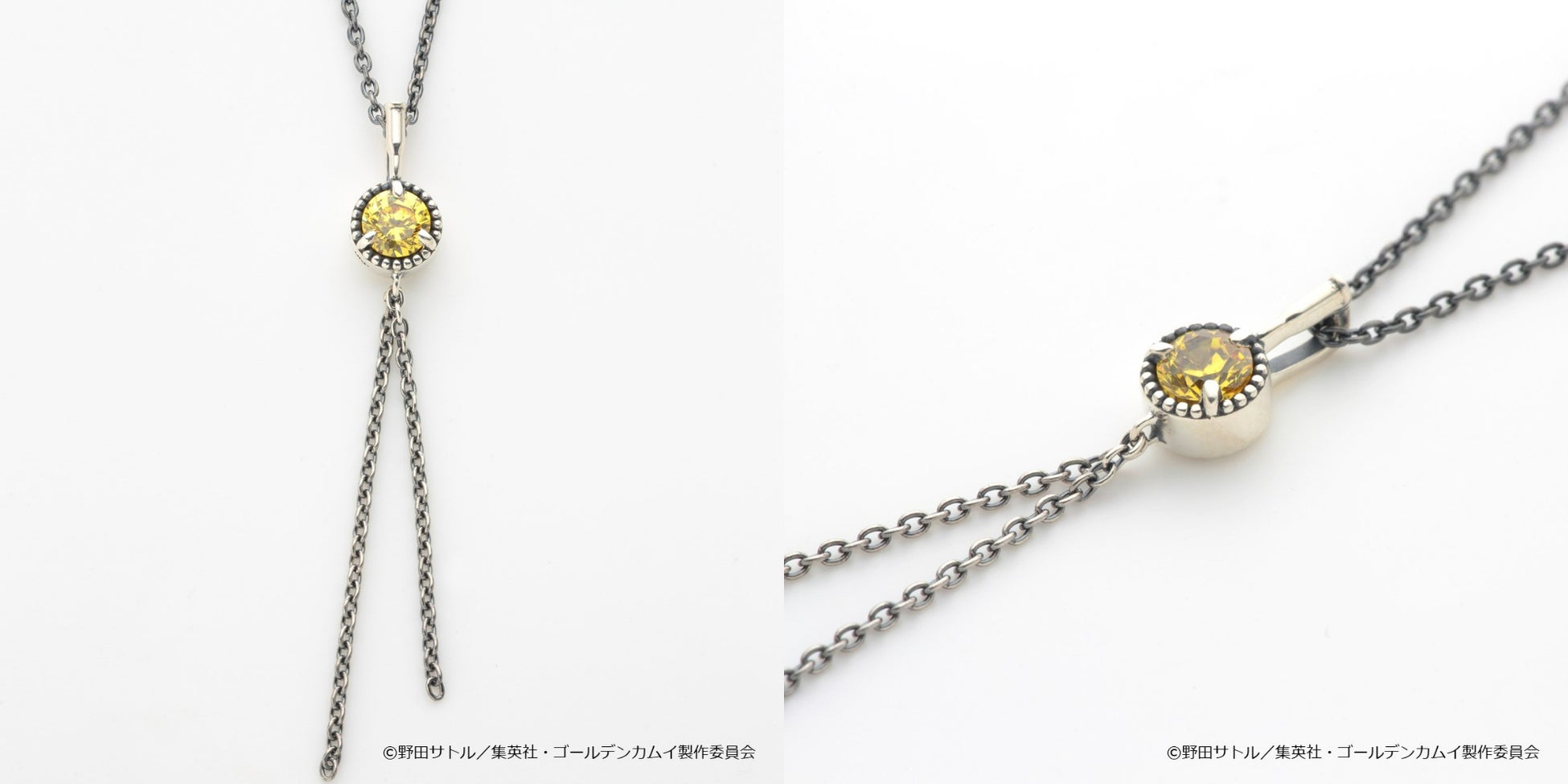 尾形をイメージしたイエローカラーのストーンを主役に、チェーンを通すバチカン部分は弾丸の形状を模した装飾を施しました。ネックレス下部には弾道をイメージしたチェーンを垂らすことで、スナイパーである尾形を表現した美しく繊細なデザインのネックレスです。
