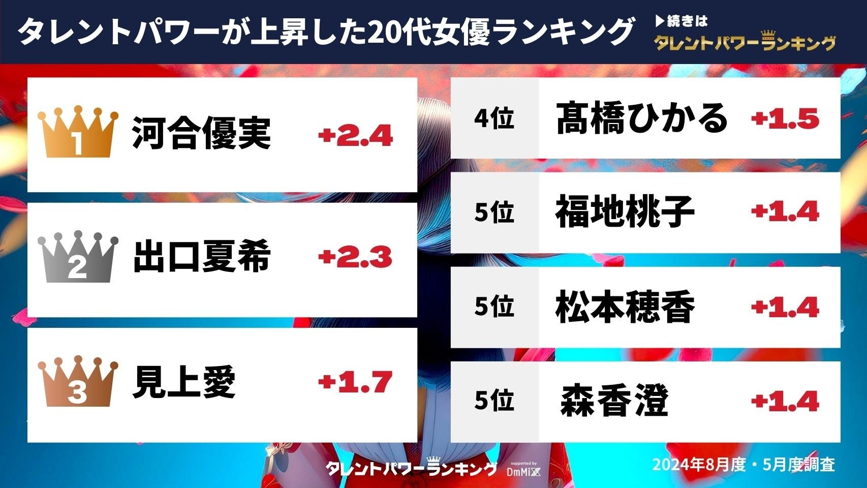 『タレントパワーランキング』では、2024年5月調査と2024年8月調査の間で、パワースコアが最も上昇した20代女優に焦点を当て、ランキング形式にまとめました。