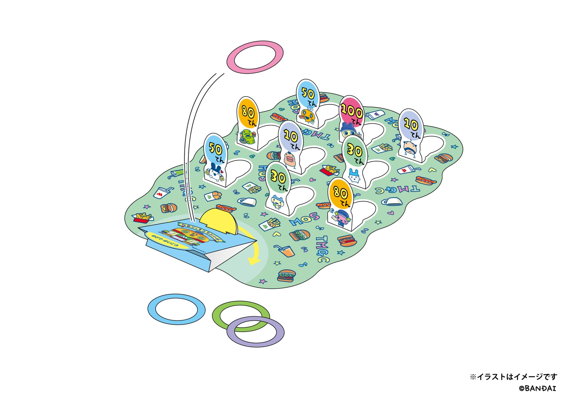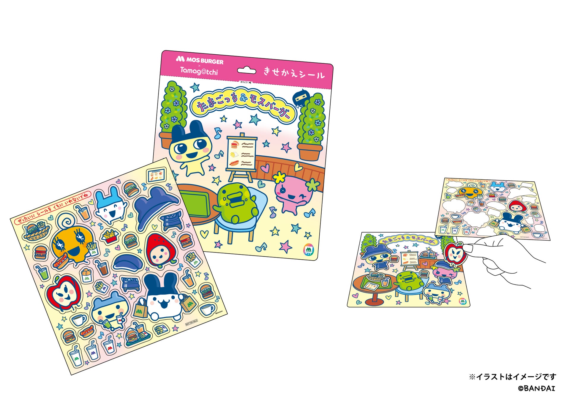 今回のコラボレーションでは、モスバーガーのコスチュームを着てキャストに扮した「まめっち」やハンバーガーを持った「くちぱっち」など、『たまごっち』のキャラクターがモスバーガーオリジナルの描き下ろしイラストで店舗に登場します。コラボおもちゃは、パスケース、ボールペン、きせかえシール、わなげあそびの4種類です。また、イートインのご利用で提供しているトレーマットにも『たまごっち』のキャラクターが登場します。