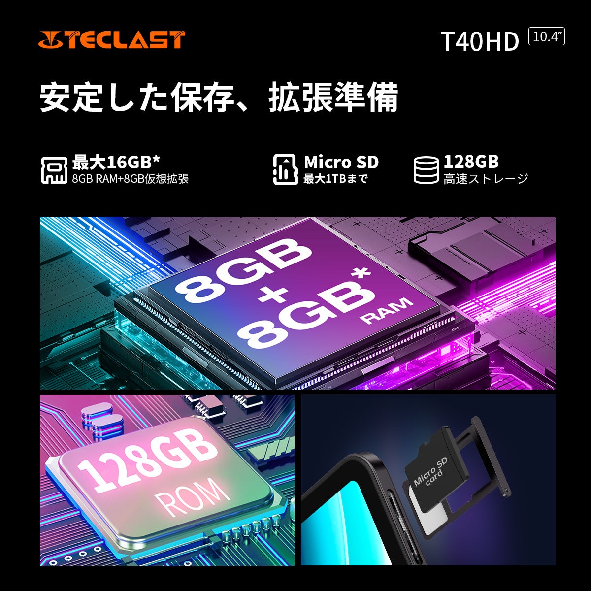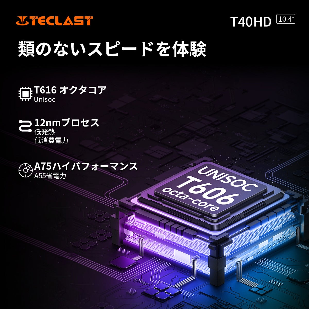 Unisoc T606オクタコアプロセッサを搭載した「T40HD」は、1.8GHzで動作する2つの高性能A75コアと6つの電力効率に優れたA55コアの組み合わせが自慢です。このブレンドにより、仕事とマルチメディアの両方で最適なパフォーマンスを保証し、シームレスでエネルギー意識の高いタブレット体験を提供します。