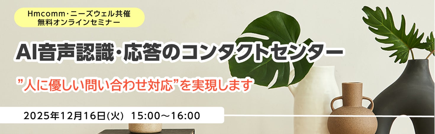 株式会社ニーズウェル(本社:東京都千代田区、代表取締役社長 松岡元)は、2025年12月16日(火)15時より、Hmcomm株式会社(以下、「Hmcomm」)・ニーズウェル共催の無料オンラインセミナー「AI音声認識・応答のコンタクトセンター ~AI音声認識・応答の”人に優しい問い合わせ対応”を実現します~」を開催します。