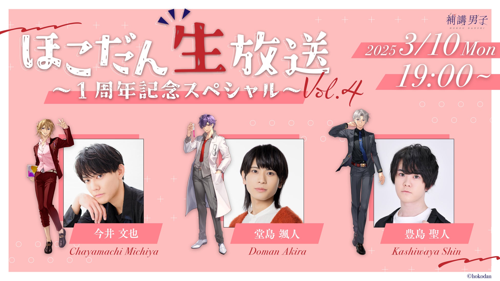 「ほこだん生放送 vol.4~1周年記念スペシャル~」出演キャストは茶屋町義也役の今井文也さん、堂満智役の堂島颯人さん、柏谷信役の豊島聖人さん。