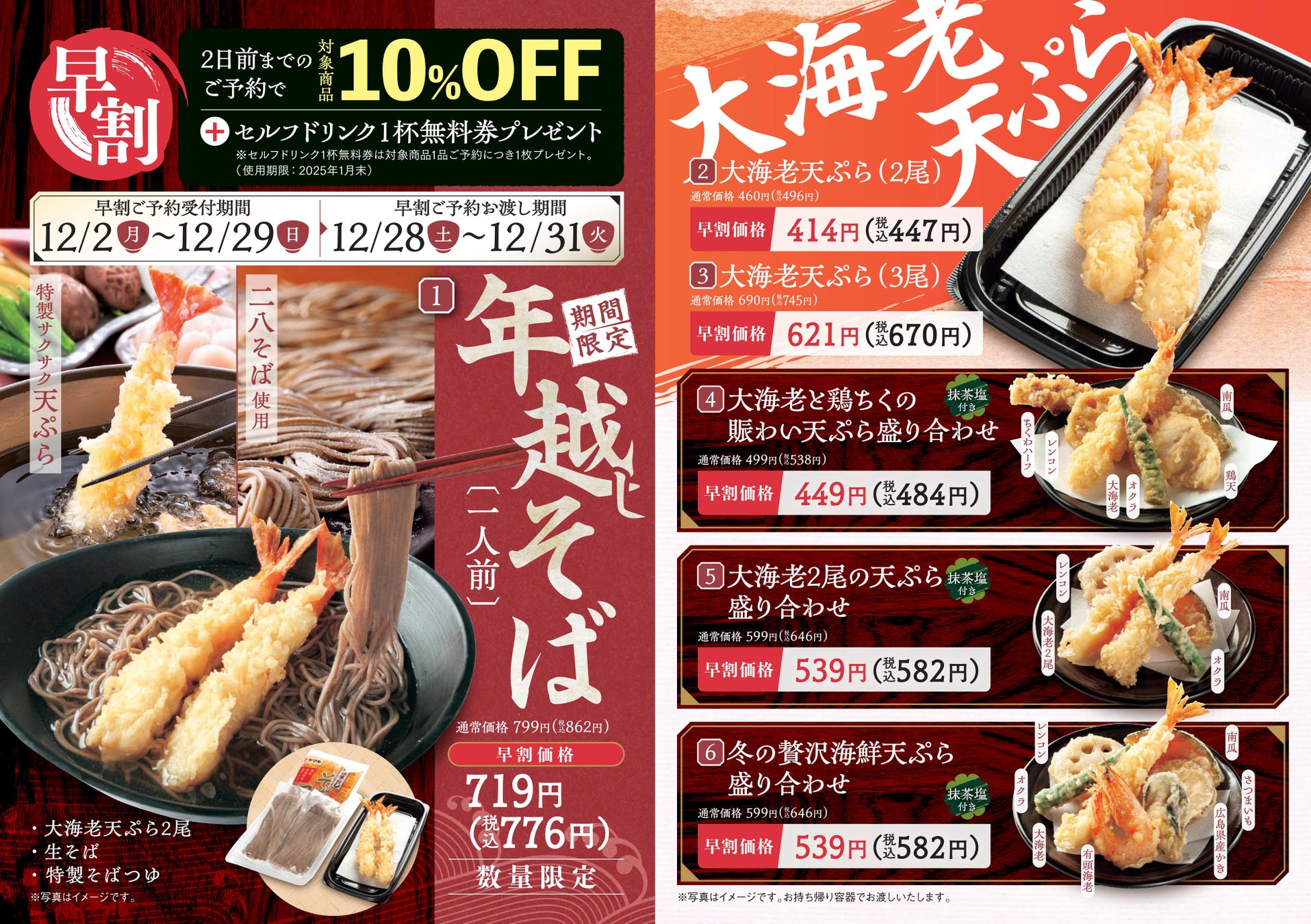 サクサク衣の特製大海老天ぷらと香り豊かな生そばがセットになった「年越しそば」などの商品がお手頃な価格でお楽しみいただけます。