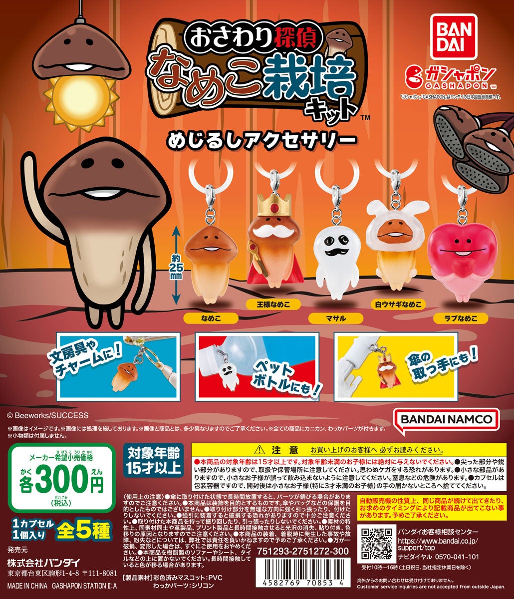 株式会社バンダイ ベンダー事業部(本社:東京都台東区)は、大人気スマホゲームアプリ「なめこ栽培キット」より『なめこ栽培キット めじるしアクセサリー』(1回300円・税10%込、全5種)を2025年1月第4週より全国のガシャポンバンダイオフィシャルショップ、玩具売り場・量販店・家電店などに設置されたガシャポン自販機シリーズにて発売いたします。