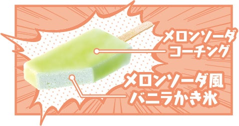 メロンソーダ風バニラかき氷をメロンソーダコーチングで包んだアイスバーです。メロンソーダ風バニラかき氷は、メロンソーダ風味のバニラアイスに細かな氷を少量混ぜ込み、「クリームソーダのうまいとこ」のシャリシャリ食感を表現しています。アイスミルク規格であるバニラアイスのしっかりとしたミルク感と爽やかな風味のメロンソーダコーチングをバランス良く仕上げました。