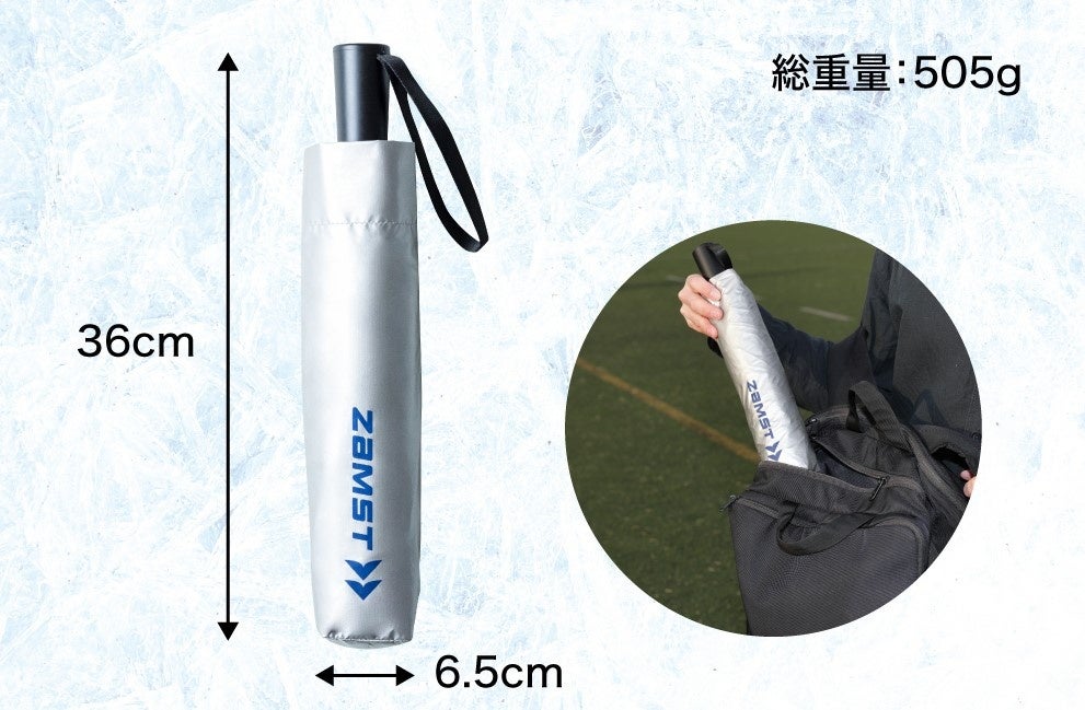 重さは505gとペットボトル1本分、収納時の全長は36cmと、リュックやトートバッグに入る大きさで、スポーツ活動・スポーツ観戦時の持ち運びに便利です。