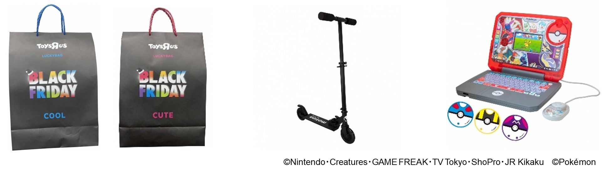 今年は、全国のトイザらス、ベビーザらス店舗※2で11月22日(金)~11月28日(木)の7日間、「おもちゃ・子ども用品」を対象としたブラックフライデーセールを開催いたします。毎年ご好評を頂いている「トイザらス Black Friday おたのしみ袋 (COOL/CUTE)」(各3,999円<税込>/メーカー希望小売価格12,000円以上相当)※3に加え、今年は「ブラックフライデー」セールにぴったりな黒色のキックスクーターを1,997円の大特価でご提供。他にも、人気キャラクターの玩具、ぬいぐるみ、知育玩具、キッズ衣料品など、遊びやおでかけの時間を楽しく過ごせるアイテムを数多く取り揃え※4、お買い得価格にてご提供いたします。